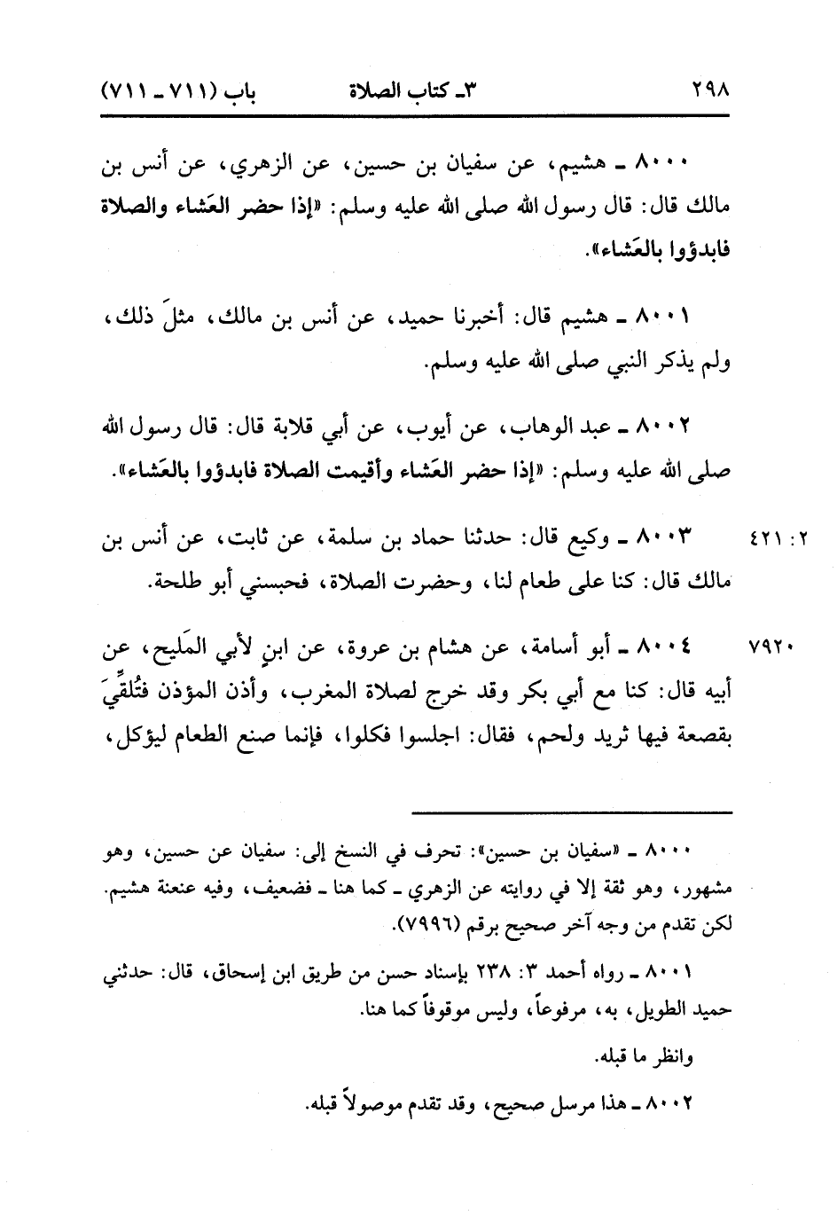 8000- حَدَّثَنَا هُشَيْمٌ ، عَنْ سُفْيَانَ بْنِ حُسَيْنٍ ، عَنِ الزُّهْرِيِّ ، عَنْ أَنَسِ بْنِ مَالِكٍ ، قَالَ : قَالَ رَسُولُ اللهِ صَلَّى الله عَلَيْهِ وَسَلَّمَ : إذَا حَضَرَتِ الْعَشَاءُ وَالصَّلاَة فَابْدَؤُوا بِالْعَشَاءِ.