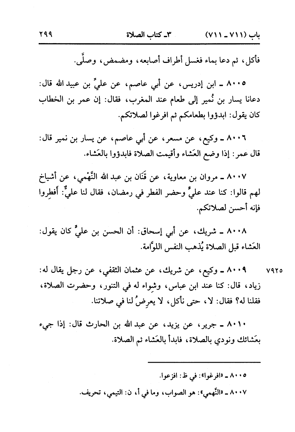 8005- حَدَّثَنَا ابْنُ إدْرِيسَ ، عَنْ أَبِي عَاصِمٍ ، عَنْ عَلِيِّ بْنِ عُبَيْدِ اللهِ ، قَالَ : دَعَانَا يَسَارُ بْنُ نُمَيْرٍ إلَى طَعَامٍ عِنْدَ الْمَغْرِبِ ، فَقَالَ : إنَّ عُمَرَ بْنَ الْخَطَّابِ كَانَ يَقُولُ : ابْدَؤُوا بِطَعَامِكُمْ ، ثُمَّ افْرُغُوا لِصَلاَتِكُمْ.