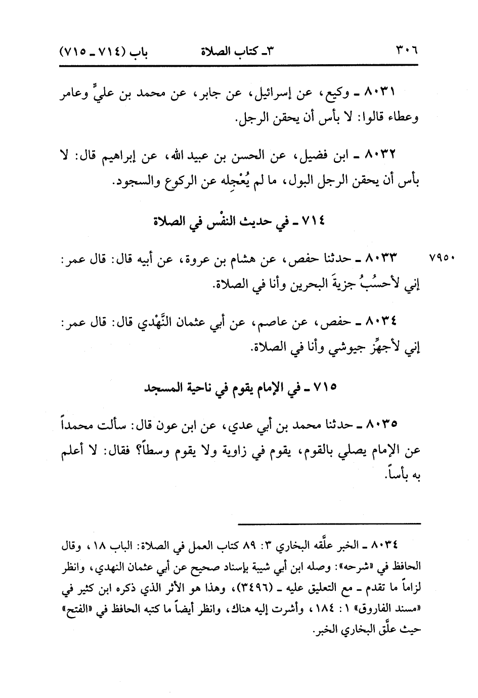 8034- حَدَّثَنَا حَفْصٌ ، عَنْ عَاصِمٍ ، عَنْ أَبِي عُثْمَانَ النَّهْدِيِّ ، قَالَ : قَالَ عُمَرُ : إنِّي لأُجَهِّزُ جُيُوشِي وَأَنَا فِي الصَّلاَةِ.