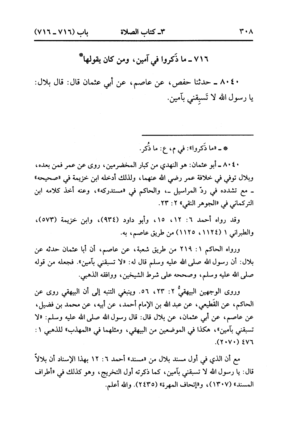 8040- حَدَّثَنَا حَفْصٌ ، عَنْ عَاصِمٍ ، عَنْ أَبِي عُثْمَانَ ، قَالَ : قَالَ بِلاَلٌ : يَا رَسُولَ اللهِ لاَ تَسْبِقْنِي بِآمِينَ. (2/425).