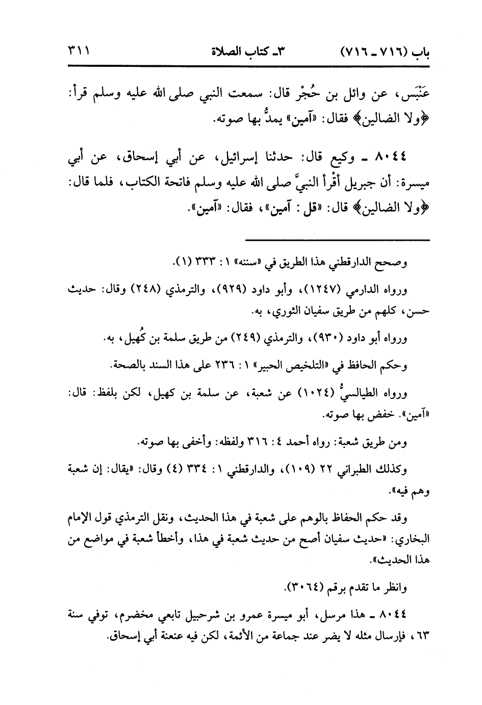 8044- حَدَّثَنَا وَكِيعٌ , قَالَ : حدَّثَنَا إسْرَائِيلُ ، عَنْ أَبِي إِسْحَاقَ ، عَنْ أَبِي مَيْسَرَةَ ؛ أَنَّ جِبْرِيل عليه السلام أَقْرَأَ النَّبِيَّ صَلَّى الله عَلَيْهِ وَسَلَّمَ فَاتِحَةَ الْكِتَابِ ، فَلَمَا قَالَ : {وَلاَ الضَّالِّينَ} قَالَ : قُلْ آمِينَ ، فَقَالَ : آمِينَ. (2/425).
