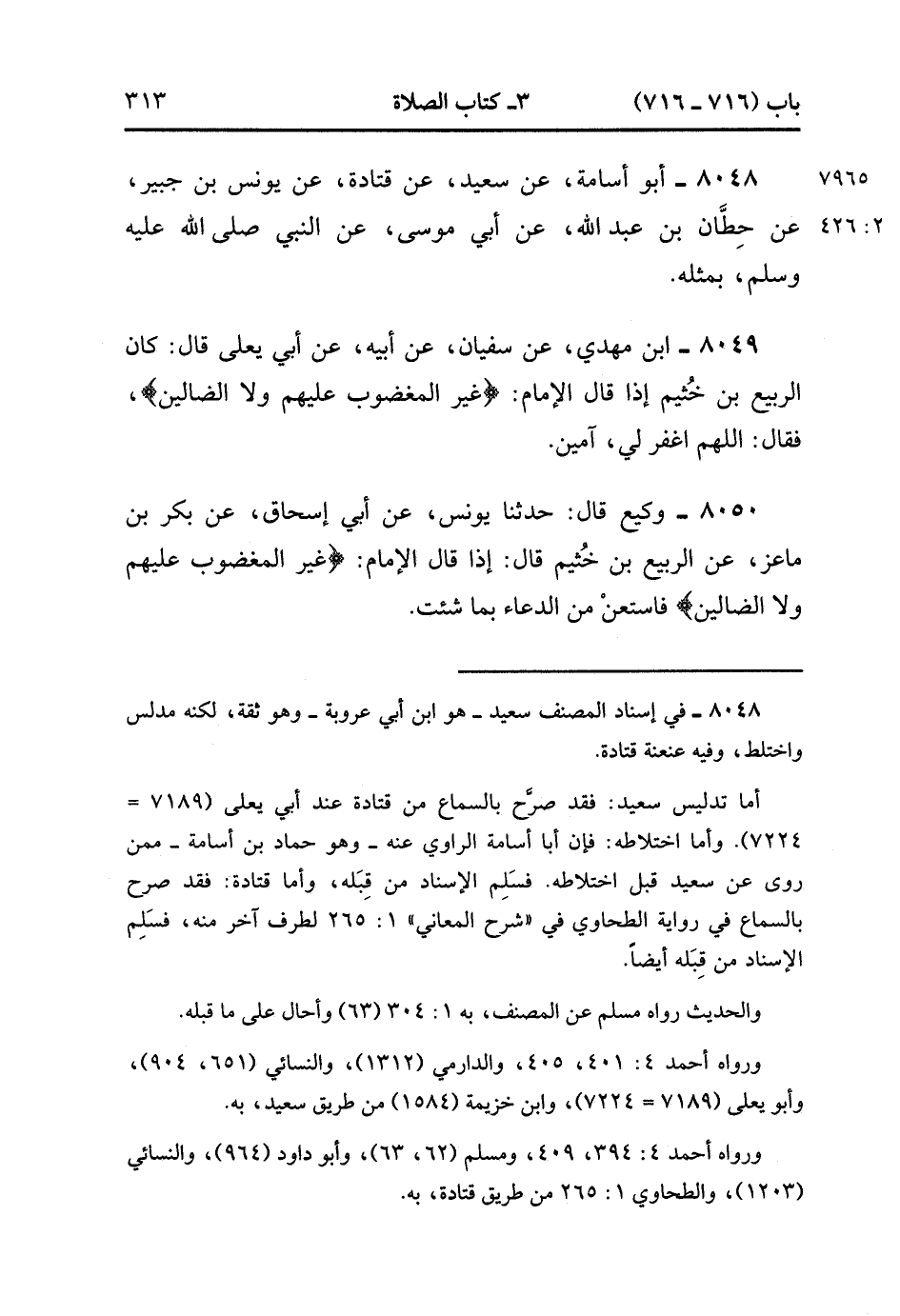 8050- حَدَّثَنَا وَكِيعٌ , قَالَ : حدَّثَنَا يُونُسُ ، عَنْ أَبِي إِسْحَاقَ ، عَنْ بَكْرِ بْنِ مَاعِز ، عَنِ الرَّبِيعِ بْنِ خُثَيم ، قَالَ : إذَا قَالَ الإِمَام : {غَيْرِ الْمَغْضُوبِ عَلَيْهِمْ وَلاَ الضَّالِّينَ} فَاسْتَعِنْ مِنَ الدُّعاء بِمَا شِئْتَ. (2/426).