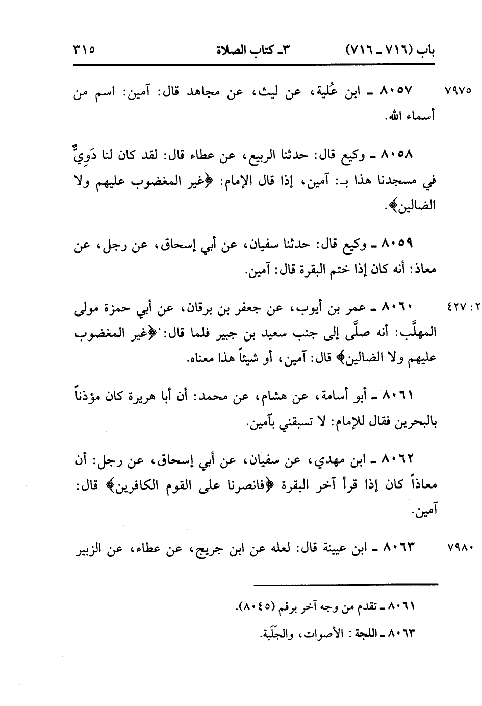 8062- حَدَّثَنَا ابْنُ مَهْدِيٍّ ، عَنْ سُفْيَانَ ، عَنْ أَبِي إِسْحَاقَ ، عَنْ رَجُلٍ ، أَنَّ مُعَاذًا كَانَ إذَا قَرَأَ آخِرَ الْبَقَرَةِ {فَانْصُرْنَا عَلَى الْقَوْمِ الْكَافِرِينَ} قَالَ : آمِينَ. (2/427).