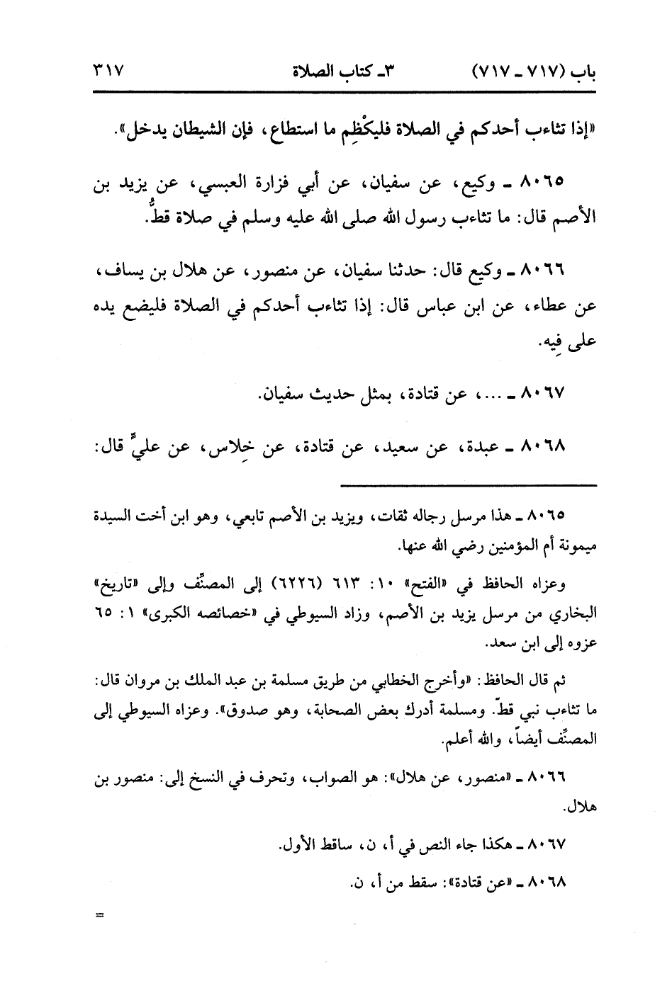 8065- حَدَّثَنَا وَكِيعٌ ، عَنْ سُفْيَانَ ، عَنْ أَبِي فَزَارَةَ الْعَبْسِيِّ ، عَنْ يَزِيدَ بْنِ الأَصَمِّ ، قَالَ : مَا تَثَاءَبَ رَسُولُ اللهِ صَلَّى الله عَلَيْهِ وَسَلَّمَ فِي صَلاَة قَطُّ.