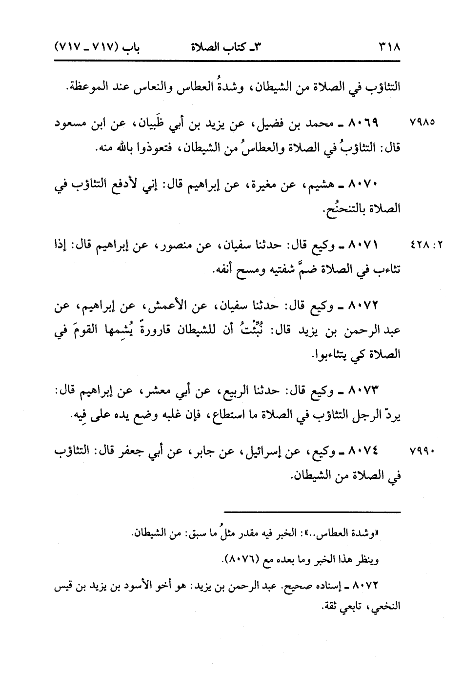 8071- حَدَّثَنَا وَكِيعٌ , قَالَ : حدَّثَنَا سُفْيَانُ ، عَنْ مَنْصُورٍ ، عَنْ إبْرَاهِيمَ ، قَالَ : إذَا تَثَاءَبَ فِي الصَّلاَة ضَمَّ شَفَتَيْهِ ، وَمَسَحَ أَنْفَهُ. (2/427)