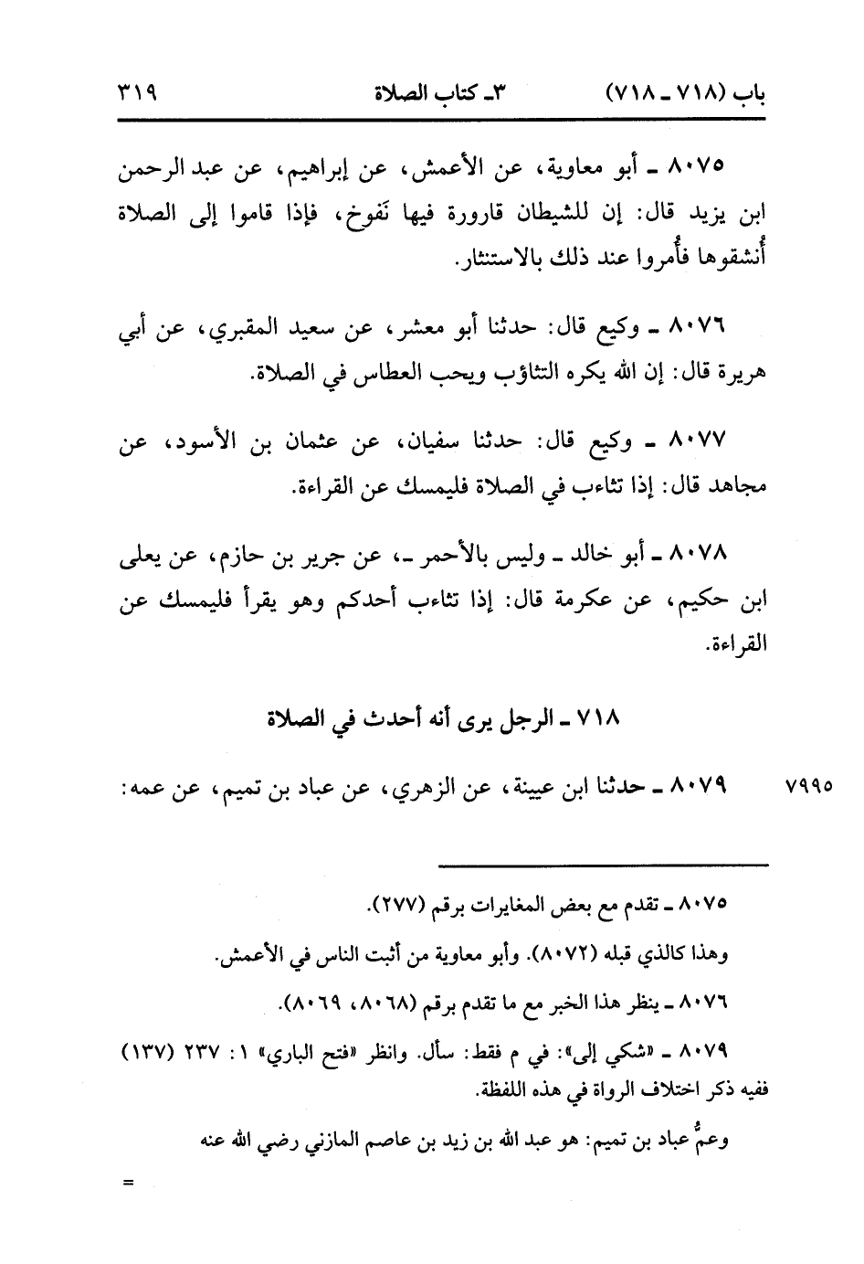 8075- حَدَّثَنَا أَبُو مُعَاوِيَةَ ، عَنِ الأَعْمَشِ ، عَنْ إِبْرَاهِيمَ ، عَنْ عَبْدِ الرَّحْمَنِ بْنِ يَزِيدَ ، قَالَ : إنَّ لِلشَّيْطَانِ قَارُورَةً فِيهَا نَفُوخٌ فَإِذَا قَامُوا إلَى الصَّلاَة أُنْشَقُوهَا فَأُمِرُوا عِنْدَ ذَلِكَ بِالاسْتِنْثَارِ.