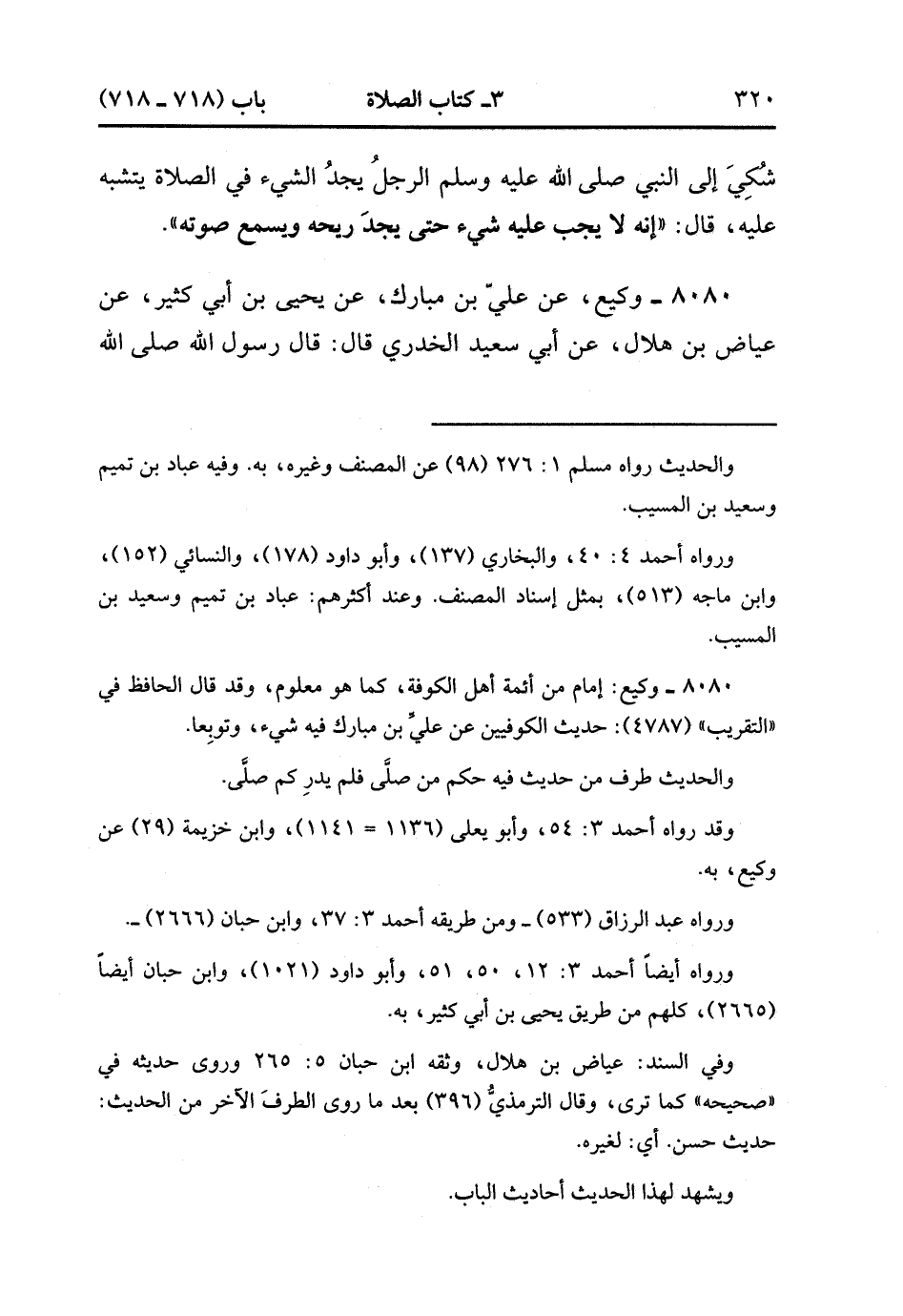 8080- حَدَّثَنَا وَكِيعٌ ، عَنْ عَلِيِّ بْنِ مُبَارَكٍ ، عَنْ يَحْيَى بْنِ أَبِي كَثِيرٍ ، عَنْ عِيَاضِ بْنِ هِلاَلٍ ، عَنْ أَبِي سَعِيدٍ الْخُدْرِيِّ ، قَالَ : قَالَ رَسُولُ اللهِ صَلَّى الله عَلَيْهِ وَسَلَّمَ : إذَا جَاءَ أَحَدَكُمُ الشَّيْطَانُ وَهُوَ فِي صَلاَتِهِ فَقَالَ لَهُ : إنَّكَ قَدْ أَحْدَثْتَ فَلْيَقُلْ : كَذَبْتَ مَا لَمْ يَجِدْ رِيحَهُ بِأَنْفِهِ ، أَوْ يَسْمَعْ صَوْتَهُ بِأُذُنِهِ. (2/428).