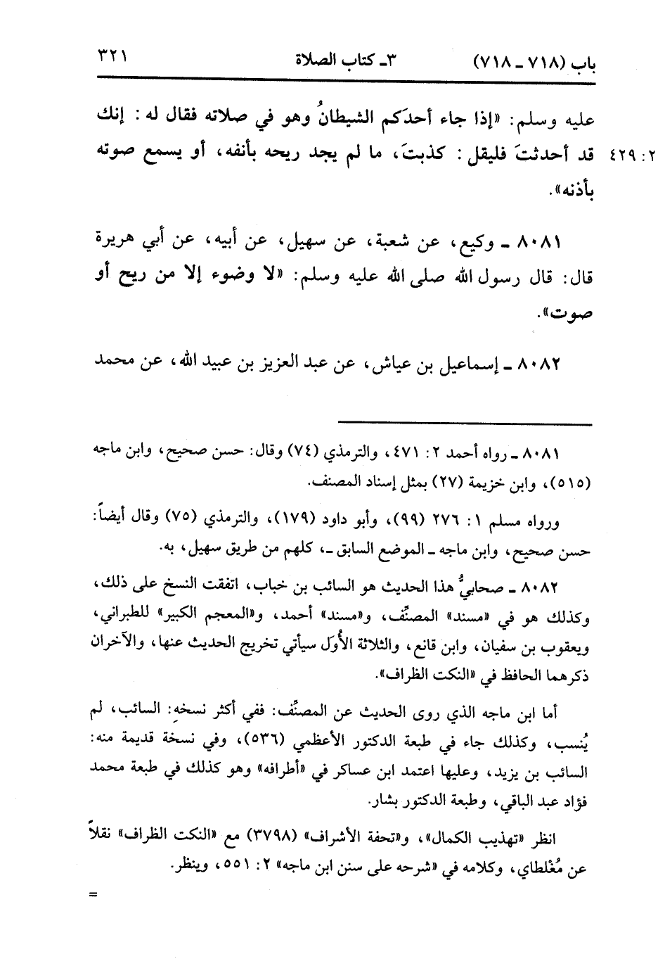 8082- حَدَّثَنَا إسْمَاعِيلُ بْنُ عَيَّاشٍ ، عَنْ عَبْدِ الْعَزِيزِ بْنِ عُبَيْدِ اللهِ ، عَنْ مُحَمَّدِ بْنِ عَمْرِو بْنِ عَطَاءٍ ، قَالَ : رَأَيْتُُ السَّائِبَ بْنَ خَبَّابٍ يَشُمُّ ثَوْبَهُ فَقُلْتُ لَهُ : مِمَّ ذَلِكَ رَحِمَك اللَّهُ ؟ فَقَالَ : إنِّي سَمِعْتُ رَسُولَ اللهِ صَلَّى الله عَلَيْهِ وَسَلَّمَ يَقُولُ : لاَ وُضُوءَ إِلاَّ مِنْ رِيحٍ ، أَوْ سَمَاعٍ. (2/429).