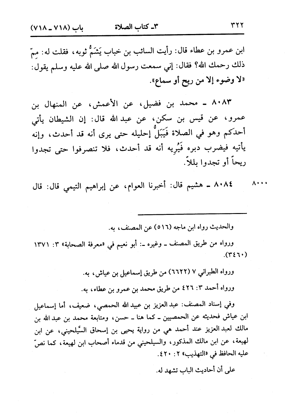 8083- حَدَّثَنَا مُحَمَّدُ بْنُ فُضَيْلٍ ، عَنِ الأَعْمَشِ ، عَنِ الْمِنْهَالِ بْنِ عَمْرٍو ، عَنْ قَيْسِ بْنِ سَكَنٍ ، عَنْ عَبْدِ اللهِ ، قَالَ : إنَّ الشَّيْطَانَ يَأْتِي أَحَدَكُمْ وَهُوَ فِي الصَّلاَة فَيَبَلُّ إحْلِيلَهُ حَتَّى يَرَى أَنَّهُ قَدْ أَحْدَثَ ، وَأَنَّهُ يَأْتِيهِ فَيَضْرِبُ دُبُرَهُ ، فَيُرِيهِ أَنَّهُ قَدْ أَحْدَثَ ، فَلاَ تَنْصَرِفُوا حَتَّى تَجِدُوا رِيحًا ، أَوْ تَجِدُوا بَلَلاً.