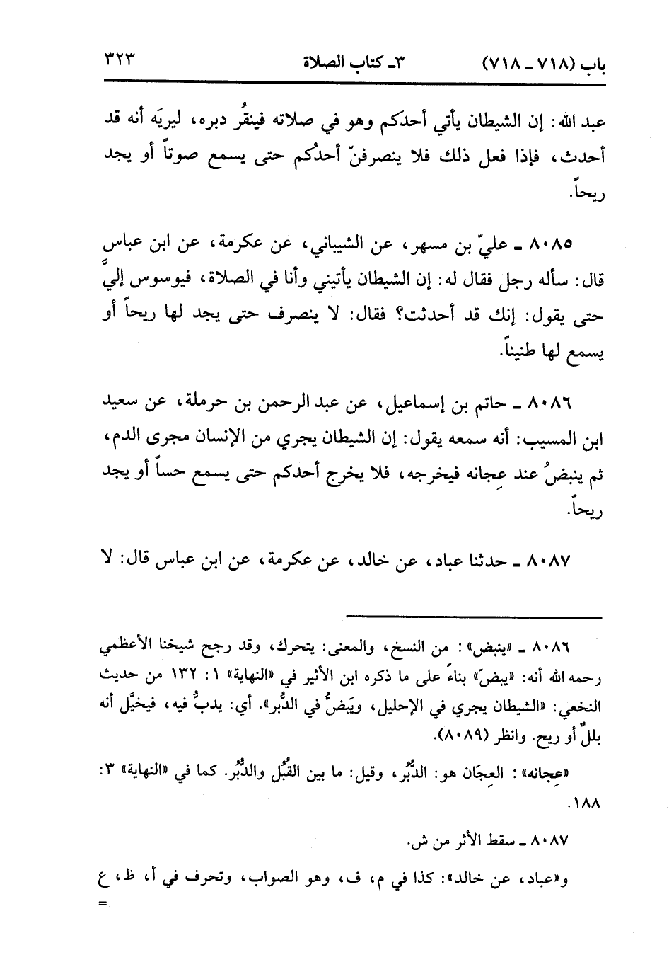 8085- حَدَّثَنَا عَلِيُّ بْنُ مُسْهِرٍ ، عَنِ الشَّيْبَانِيِّ ، عَنْ عِكْرِمَةَ ، عَنِ ابْنِ عَبَّاسٍ ، قَالَ : سَأَلَهُ رَجُلٌ فَقَالَ لَهُ : إنَّ الشَّيْطَانَ يَأْتِينِي وَأَنَا فِي الصَّلاَة فَيُوَسْوِسُ إليّ حَتَّى يَقُولَ : إنَّكَ قَدْ أَحْدَثْتَ ، فَقَالَ : لاَ يَنْصَرِفْ حَتَّى يَجِدَ لَهَا رِيحًا ، أَوْ يَسْمَعَ لَهَا طَنِينًا.