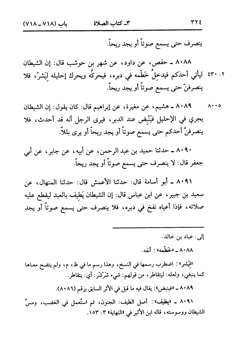8091- حَدَّثَنَا أَبُو أُسَامَةَ , قَالَ : حدَّثَنَا الأَعْمَشُ ، قَالَ : حَدَّثَنَا الْمِنْهَالُ ، عَنْ سَعِيدِ بْنِ جُبَيْرٍ ، عَنِ ابْنِ عَبَّاسٍ ، قَالَ : إنَّ الشَّيْطَانَ يَطِيفُ بِالْعَبْدِ لِيَقْطَعَ عَلَيْهِ صَلاَتَهُ فَإِذَا أَعْيَاهُ نَفَخَ فِي دُبُرِهِ فَلاَ يَنْصَرِفْ حَتَّى يَسْمَعَ صَوْتًا ، أَوْ يَجِدَ رِيحًا ، وَيَأْتِيهِ فَيَعْصِرُ ذَكَرَهُ فَيُرِيهِ أَنَّهُ أُخْرِجَ مِنْهُ شَيْءٌ فَلاَ يَنْصَرِفْ حَتَّى يَسْتَيْقِنَ. (2/430).