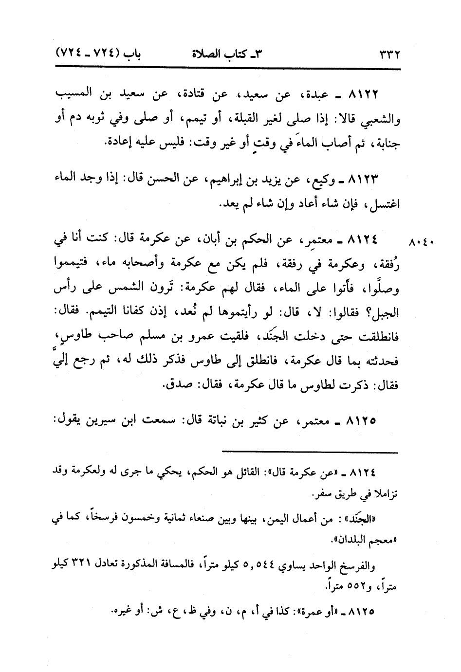 8124- حَدَّثَنَا مُعْتَمِرُ ، عَنِ الْحَكَمِ بْنِ أَبَانَ ، عَنْ عِكْرِمَةَ ، قَالَ : كُنْتُ أَنَا فِي رُفْقَةٍ ، وعِكْرِمَةَ في رُفْقَةٍ ، فَلَمْ يَكُنْ مَعَ عِكْرِمَةَ وَأَصْحَابِهِ مَاءٌ فَتَيَمَّمُوا وَصَلَّوْا فَأَتَوْا عَلَى الْمَاءِ ، فَقَالَ لَهُم عِكْرِمَةُ : تَرَوْنَ الشَّمْسَ عَلَى رَأْسِ الْجَبَلِ ؟ فَقَالُوا : لاَ ، قَالَ : لَوْ رَأَيْتُمُوهَا لَمْ نُعِدْ إذًا كَفَانَا التَّيَمُّمُ ، فَقَالَ : فَانْطَلَقْتُ حَتَّى دَخَلْت الْجَنَد فَلَقِيتُ عَمْرَو بْنَ مُسْلِمٍ صَاحِبَ طَاوُوس ، فَحَدَّثْتُهُ بِمَا قَالَ عِكْرِمَةُ ، فَانْطَلَقَ إلَى طَاوُوس فَذَكَرَ ذَلِكَ لَهُ ثُمَّ رَجَعَ إلَيَّ فَقَالَ : ذَكَرْتُ لِطَاوُوس مَا قَالَ عِكْرِمَةُ فَقَالَ : صَدَقَ. (2/434).
