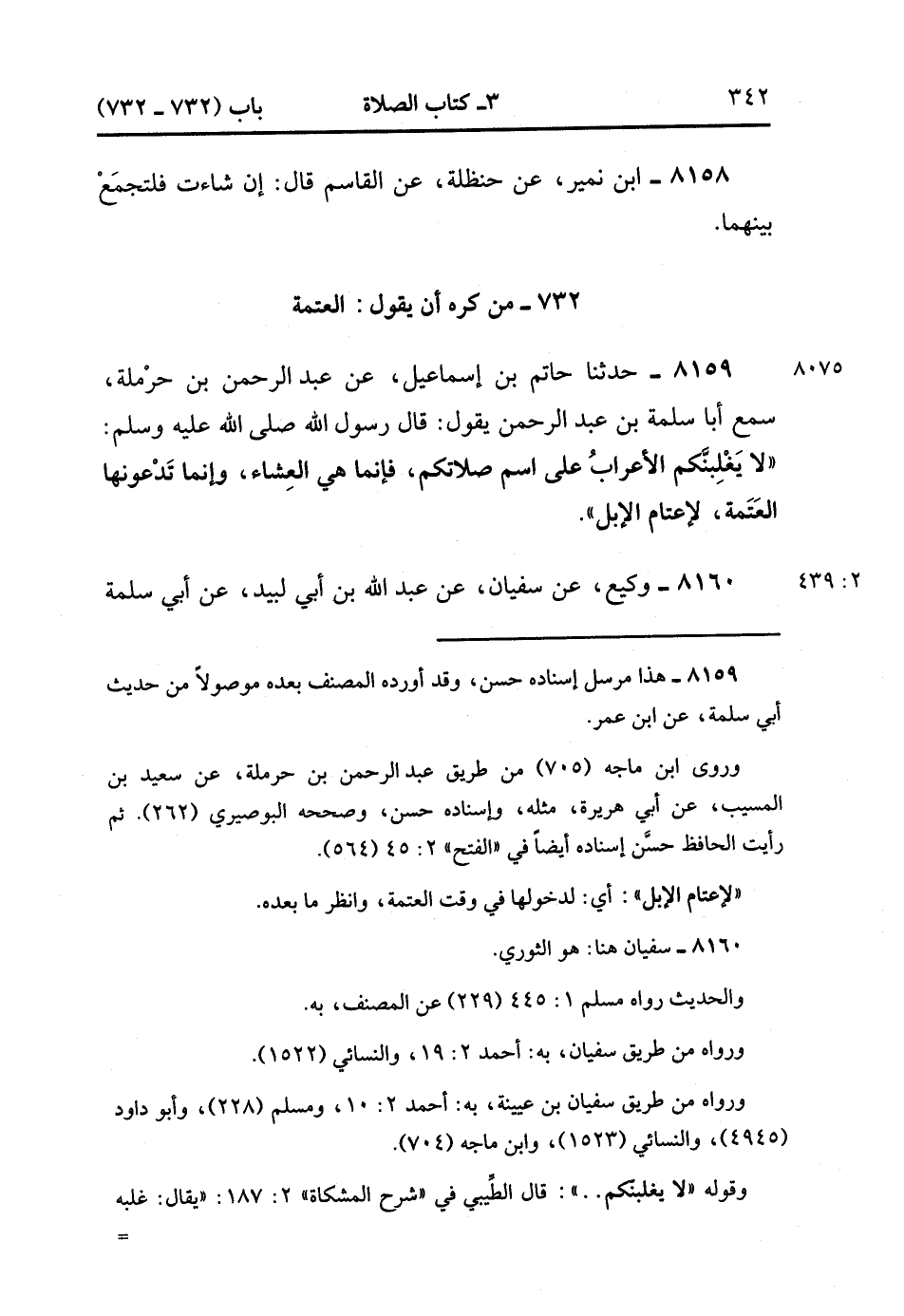 8159- حَدَّثَنَا حَاتِمُ بْنُ إسْمَاعِيلَ ، عَنْ عَبْدِ الرَّحْمَنِ بْنِ حَرْمَلَةَ ، سَمِعَ أَبَا سَلَمَةَ بْنَ عَبْدِ الرَّحْمَنِ يَقُولُ : قَالَ رَسُولُ اللهِ صَلَّى الله عَلَيْهِ وَسَلَّمَ : لاَ يَغْلِبَنَّكُمُ الأَعْرَابُ عَلَى اسْمِ صَلاَتِكُمْ فَإِنَّمَا هِيَ الْعِشَاءُ وَإِنَّمَا تَدْعُونَهَا الْعَتَمَةُ لإعْتَامِ الإِبِلِ. (2/438).