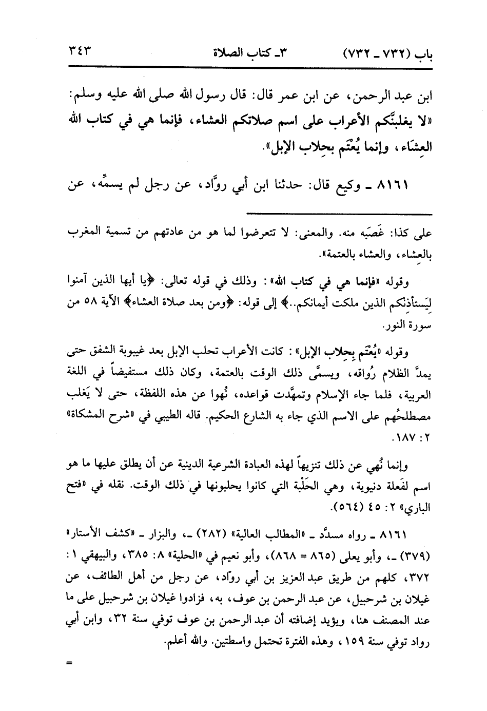 8161- حَدَّثَنَا وَكِيعٌ , قَالَ : حدَّثَنَا ابْنُ أَبِي رَوَّادٍ ، عَنْ رَجُلٍ لَمْ يُسَمِّهِ ، عَنْ عَبْدِ الرَّحْمَنِ بْنِ عَوْفٍ ، قَالَ : قَالَ رَسُولُ اللهِ صَلَّى الله عَلَيْهِ وَسَلَّمَ : لاَ يَغْلِبَنَّكُمُ الأَعْرَابُ عَلَى اسْمِ صَلاَتِكُمُ الْعِشَاءِ ، فَإِنَّمَا هِيَ فِي كِتَابِ اللهِ الْعِشَاءُ ، وَإِنَّمَا يُعْتَمُ بِحِلاَبِ الإِبِلِ. (2/439).