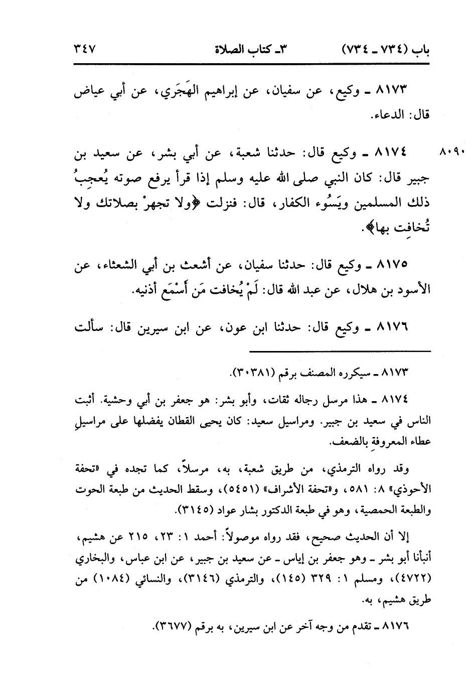 8174- حَدَّثَنَا وَكِيعٌ , قَالَ : حدَّثَنَا شُعْبَةُ ، عَنِ أَبِي بِشْرٍ ، عَنْ سَعِيدِ بْنِ جُبَيْرٍ ، قَالَ : كَانَ النَّبِيُّ صَلَّى الله عَلَيْهِ وَسَلَّمَ إذَا قَرَأَ يَرْفَعُ صَوْتَهُ يُعْجِبُ ذَلِكَ الْمُسْلِمِينَ وَيَسُوءُ الْكُفَّارَ ، قَالَ فَنَزَلَتْ : {وَلاَ تَجْهَرْ بِصَلاَتِكَ وَلاَ تُخَافِتْ بِهَا}.