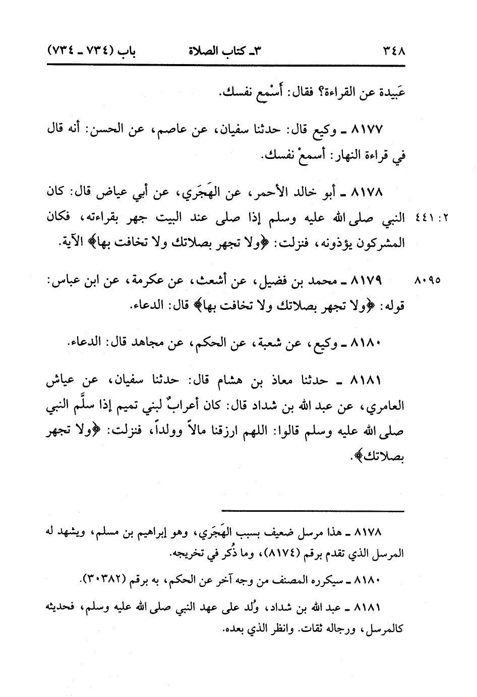 8181- حَدَّثَنَا مُعَاذُ بْنُ هِشَامٍ , قَالَ : حدَّثَنَا سُفْيَانُ ، عَنْ عَيَّاشٍ الْعَامِرِيِّ ، عَنْ عَبْدِ اللهِ بْنِ شَدَّادٍ ، قَالَ : كَانَ أَعْرَابٌ لِبَنِي تَمِيمٍ إذَا سَلَّمَ النَّبِيُّ صَلَّى الله عَلَيْهِ وَسَلَّمَ قَالُوا : اللَّهُمَّ ارْزُقْنَا مَالاً وَوَلَدًا ، فَنَزَلَتْ {وَلاَ تَجْهَرْ بِصَلاَتِك}. (2/441).