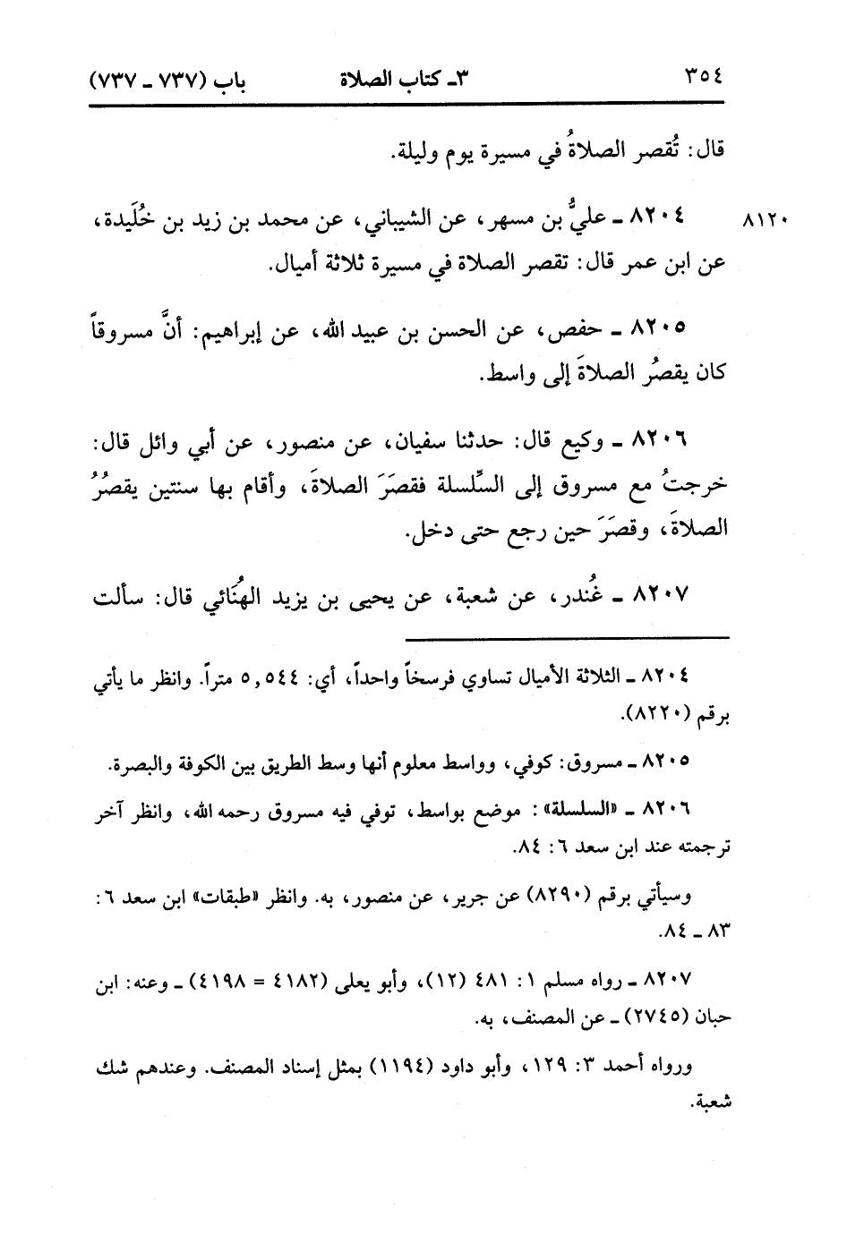 8206- حَدَّثَنَا وَكِيعٌ , قَالَ : حدَّثَنَا سُفْيَانُ ، عَنْ مَنْصُورٍ ، عَنْ أَبِي وَائِلٍ ، قَالَ : خَرَجْت مَعَ مَسْرُوقٍ إلَى السِّلْسِلَةِ فَقَصَرَ الصَّلاَة وَأَقَامَ بِهَا سَنَتَيْنِ يَقْصُرُ الصَّلاَة وَقَصَرَ حِينَ رَجَعَ حَتَّى دَخَلَ.