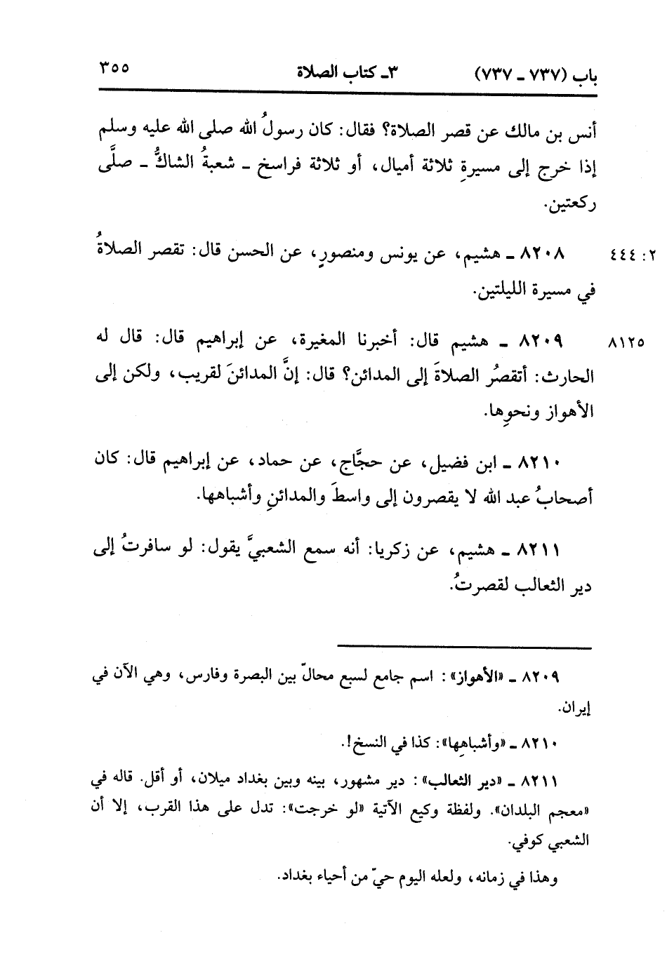 8209- حَدَّثَنَا هُشَيْمٌ , قَالَ : أَخْبَرَنَا الْمُغِيرَةُ ، عَنْ إبْرَاهِيمَ ، قَالَ : قَالَ لَهُ الْحَارِثُ : أَتَقْصُرُ الصَّلاَة إلَى الْمَدَائِنِ ؟ قَالَ : إنَّ الْمَدَائِنَ لَقَرِيبٌ وَلَكِنْ إلَى الأَهْوَازِ وَنَحْوِهَا.