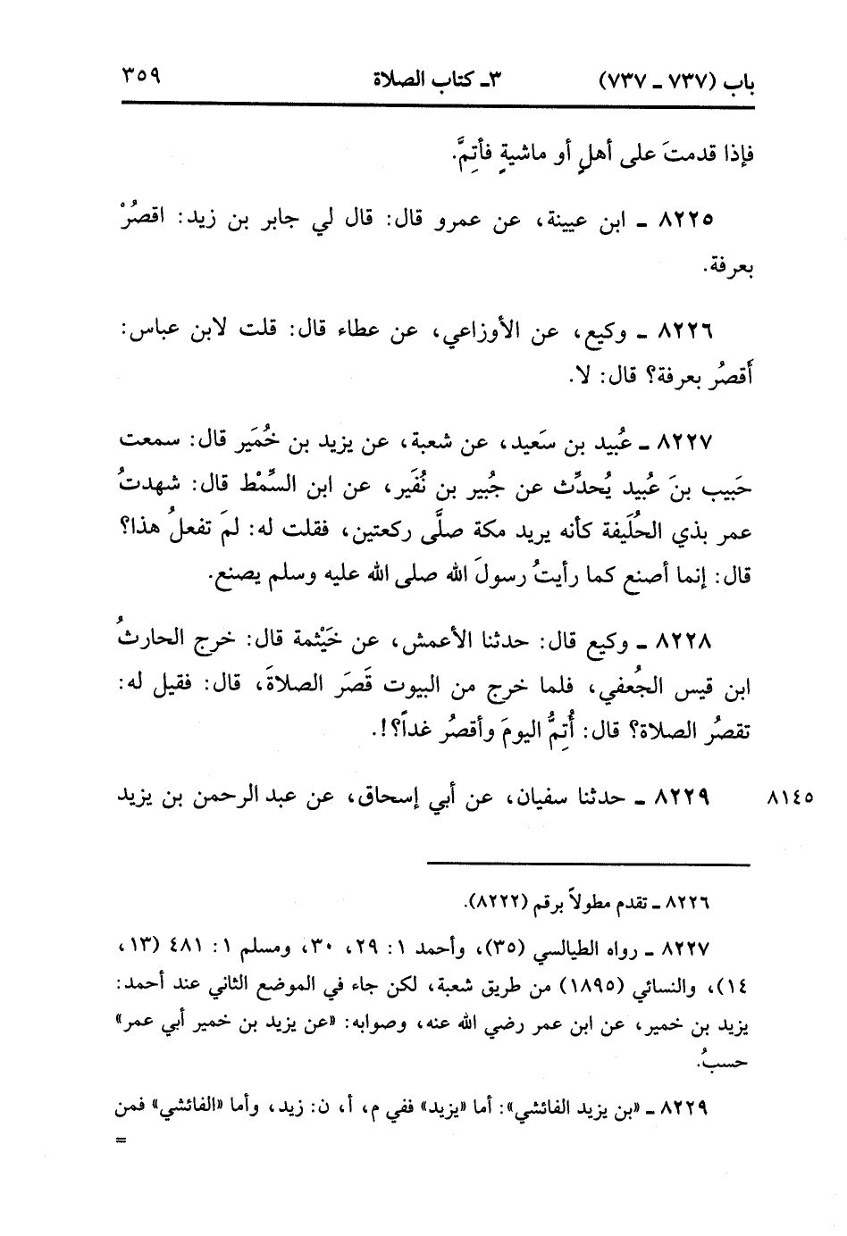 8225- حَدَّثَنَا ابْنُ عُيَيْنَةَ ، عَنْ عَمْرٍوَ ، قَالَ : قَالَ لِي جَابِرُ بْنُ زَيْدٍ : اقْصُرْ بِعَرَفَةَ.
