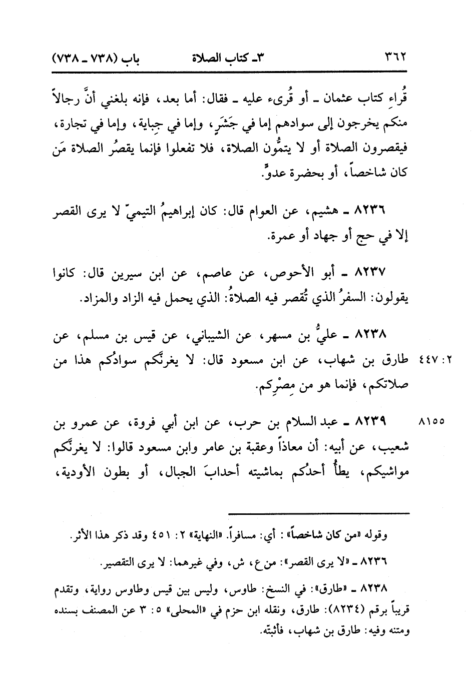 8238- حَدَّثَنَا عَلِيُّ بْنُ مُسْهِرٍ ، عَنِ الشَّيْبَانِيِّ ، عَنْ قَيْسِ بْنِ مُسْلِمٍ ، عَنْ طَارق بْنِ شِهَابٍ ، عَنِ ابْنِ مَسْعُودٍ ، قَالَ : لاَ يَغُرَّنكُمْ سَوَادُكُمْ هَذَا مِنْ صَلاَتِكُمْ فَإِنَّمَا هُوَ مِنْ مِصْرِكُمْ. (2/446)