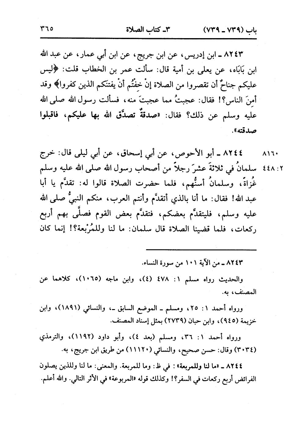 8244- حَدَّثَنَا أَبُو الأَحْوَصِ ، عَنْ أَبِي إِسْحَاقَ ، عَنْ أَبِي لَيْلَى ، قَالَ : خَرَجَ سَلْمَانُ فِي ثَلاَثَةَ عَشَرَ رَجُلاً مِنْ أَصْحَابِ رَسُولِ اللهِ صَلَّى الله عَلَيْهِ وَسَلَّمَ غُزَاةً وَسَلْمَانُ أَسَنُّهُمْ ، فَلَمَّا حَضَرَتِ الصَّلاَة قَالُوا لَهُ : تَقَدَّمْ يَا أَبَا عَبْدِ اللهِ ، فَقَالَ : مَا أَنَا بِاَلَّذِي أَتَقَدَّمُ وَأَنْتُمَ الْعَرَبُ مِنْكُمُ النَّبِيُّ صَلَّى الله عَلَيْهِ وَسَلَّمَ فَلْيَتَقَدَّمْ بَعْضُكُمْ ، فَتَقَدَّمَ بَعْضُ الْقَوْمِ فَصَلَّى بِهِمْ أَرْبَعَ رَكَعَاتٍ ، فَلَمَّا قَضَيْنَا الصَّلاَة قَالَ سَلْمَانُ : وَمَا لِلْمُرْبَعَةِ ، إنَّمَا كَانَ يَكْفِينَا رَكْعَتَانِ نِصْفُ الْمُرْبَعَةِ. (2/447).