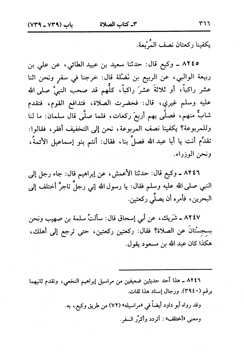 8247- حَدَّثَنَا شَرِيكٌ ، عَنِ أَبِي إِسْحَاقَ ، قَالَ : سَأَلْتُ سَلَمَةَ بْنَ صُهَيْبٍ وَنَحْنُ بِسِجِسْتَانَ ، عَنِ الصَّلاَة ، فَقَالَ : رَكْعَتَيْنِ رَكْعَتَيْنِ حَتَّى تَرْجِعَ إلَى أَهْلِكَ ، هَكَذَا كَانَ عَبْدُ اللهِ بْنُ مَسْعُودٍ يَقُولُ. (2/448).
