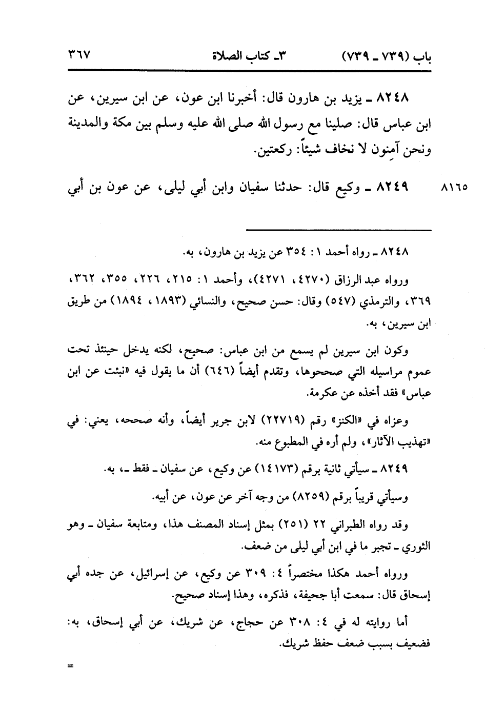 8249- حَدَّثَنَا وَكِيعٌ , قَالَ : حدَّثَنَا سُفْيَانُ ، وَابْنُ أَبِي لَيْلَى ، عَنْ عَوْنِ بْنِ أَبِي جُحَيْفَةَ السُّوَائِيِّ ، عَنْ أَبِيهِ ، قَالَ : صَلَّيْتُ مَعَ النَّبِيِّ صَلَّى الله عَلَيْهِ وَسَلَّمَ بِمِنًى الظُّهْرَ رَكْعَتَيْنِ ، ثُمَّ لَمْ يَزَلْ يُصَلِّي رَكْعَتَيْنِ حَتَّى رَجَعَ إلَى الْمَدِينَةِ. (2/448).