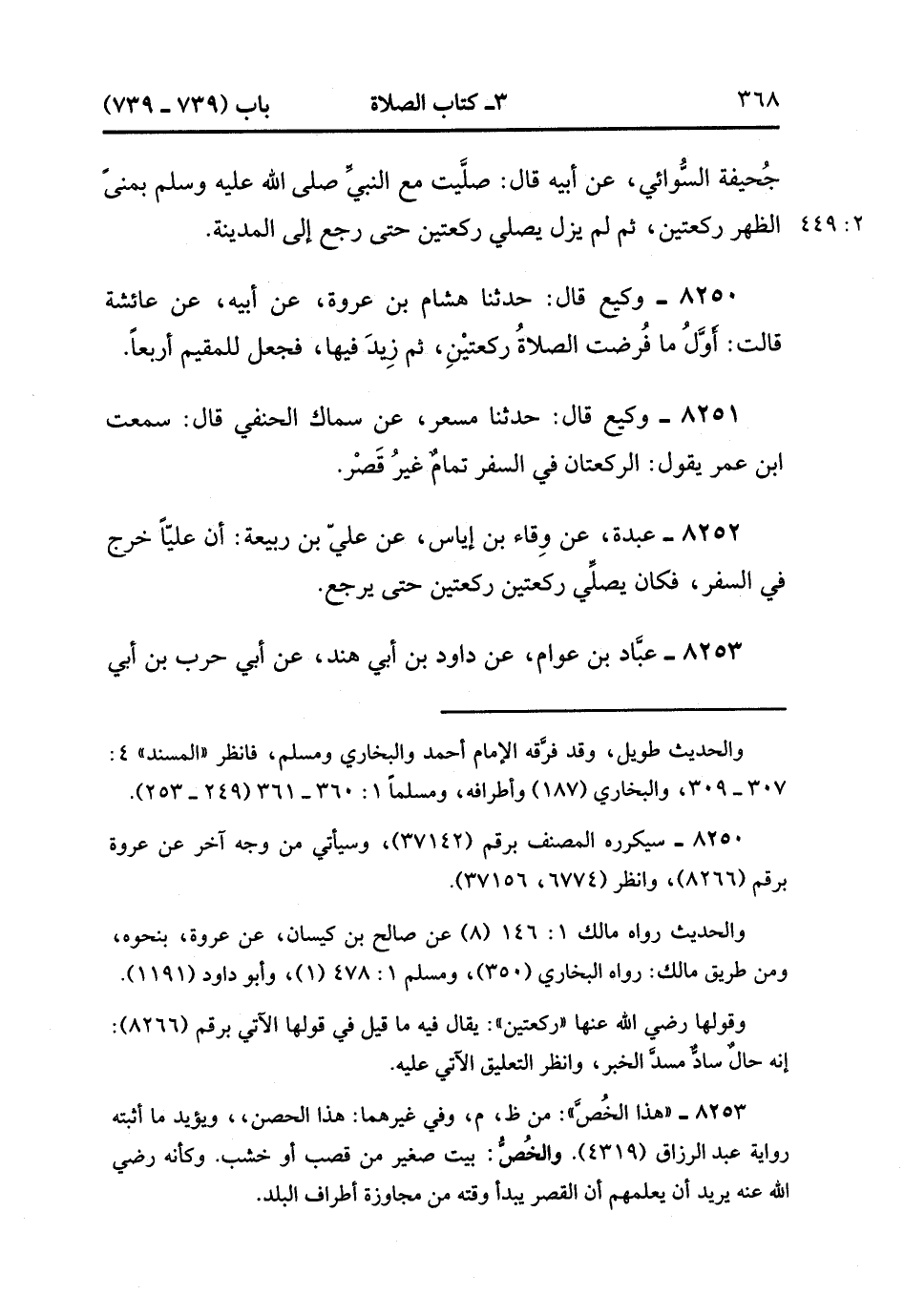 8250- حَدَّثَنَا وَكِيعٌ , قَالَ : حدَّثَنَا هِشَامُ بْنُ عُرْوَةَ ، عَنْ أَبِيهِ ، عَنْ عَائِشَةَ ، قَالَتْ : أَوَّلُ مَا فُرِضَتِ الصَّلاَة رَكْعَتَيْنِ ، ثُمَّ زِيدَ فِيهَا فَجَعَلَ لِلْمُقِيمِ أَرْبَعًا.