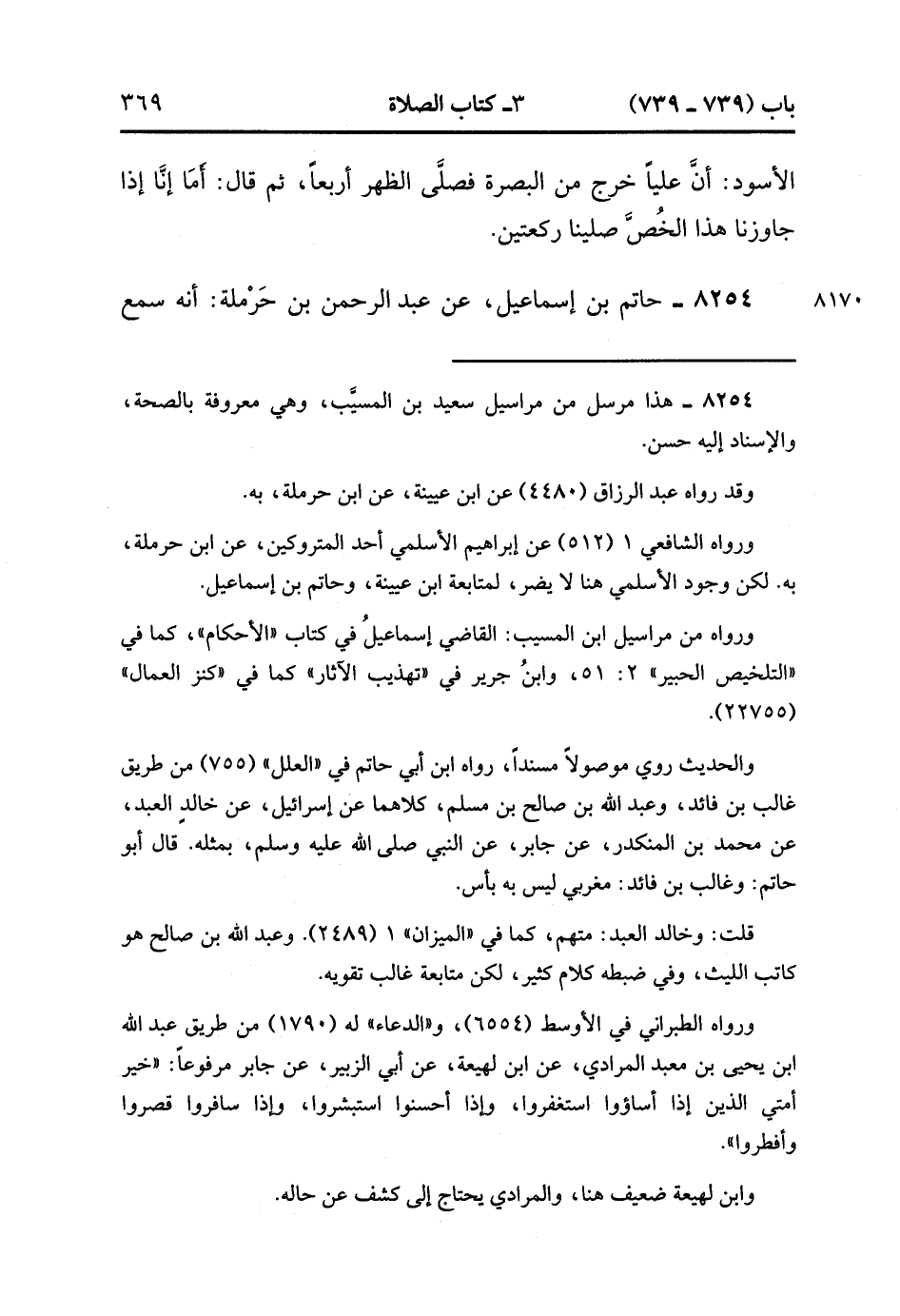 8254- حَدَّثَنَا حَاتِمُ بْنُ إسْمَاعِيلَ ، عَنْ عَبْدِ الرَّحْمَنِ بْنِ حَرْمَلَةَ ، أَنَّهُ سَمِعَ رَجُلاً يَسْأَلُ سَعِيدَ بْنَ الْمُسَيَّبِ أُتِمُّ الصَّلاَة وَأَصُومُ فِي السَّفَرِ ؟ قَالَ : لاَ ، قَالَ : فَإِنِّي أَقْوَى عَلَى ذَلِكَ ، قَالَ : كَانَ رَسُولُ اللهِ صَلَّى الله عَلَيْهِ وَسَلَّمَ أَقْوَى مِنْك كَانَ يَقْصُرُ الصَّلاَة فِي السَّفَرِ وَيُفْطِرُ ، وَقَالَ رَسُولُ اللهِ صَلَّى الله عَلَيْهِ وَسَلَّمَ : خِيَارُكُمْ مَنْ قَصَرَ الصَّلاَة فِي السَّفَرِ وَأَفْطَرَ. (2/449).