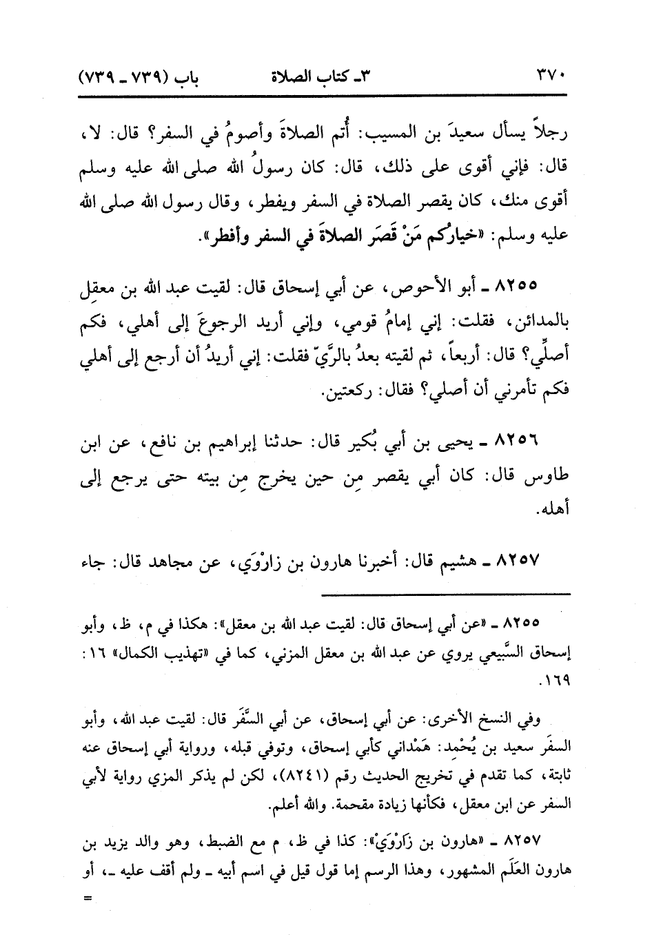 8257- حَدَّثَنَا هُشَيْمٌ , قَالَ : أَخْبَرَنَا هَارُونُ بْنُ زَارْوَي ، عَنْ مُجَاهِدٍ ، قَالَ : جَاءَ رَجُلٌ إلَى ابْنِ عَبَّاسٍ ، فَقَالَ : إنِّي وَصَاحِبٌ لِي كُنَّا فِي سَفَرٍ فَكُنْتُ أُتِمُّ وَكَانَ صَاحِبِي يَقْصُرُ ، فَقَالَ لَهُ ابْنُ عَبَّاسٍ : بَلْ أَنْتَ الَّذِي كُنْتُ تَقْصُرُ وَصَاحِبُك الَّذِي كَانَ يُتِمُّ. (2/449).