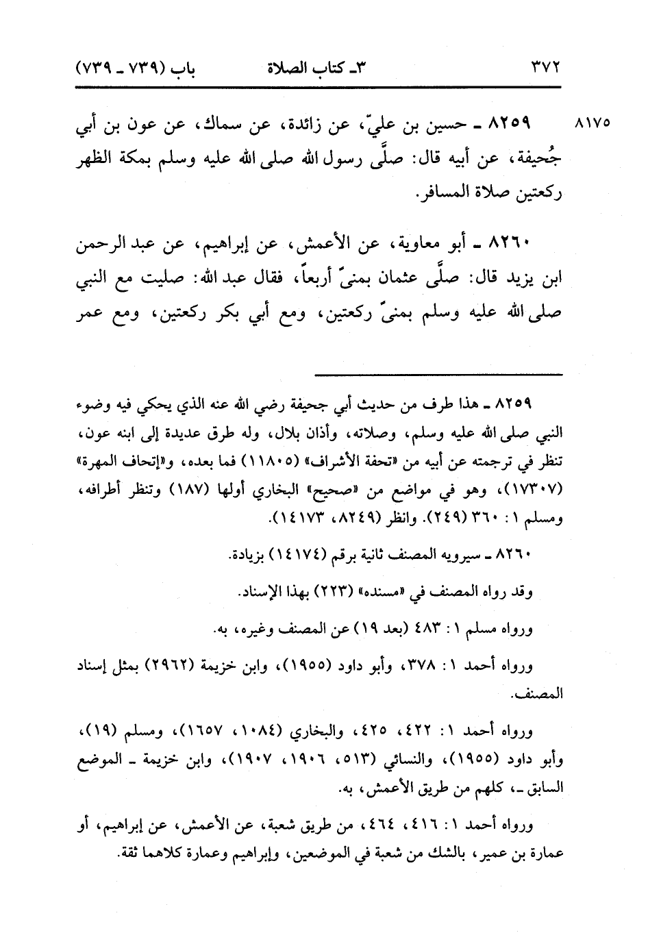 8259- حَدَّثَنَا حُسَيْنُ بْنُ عَلِيٍّ ، عَنْ زَائِدَةَ ، عَنْ سِمَاكٍ ، عَنْ عَوْنِ بْنِ أَبِي جُحَيْفَةَ ، عَنْ أَبِيهِ ، قَالَ : صَلَّى رَسُولُ اللهِ صَلَّى الله عَلَيْهِ وَسَلَّمَ بِمَكَّةَ الظُّهْرَ رَكْعَتَيْنِ صَلاَةَ الْمُسَافِرِ.