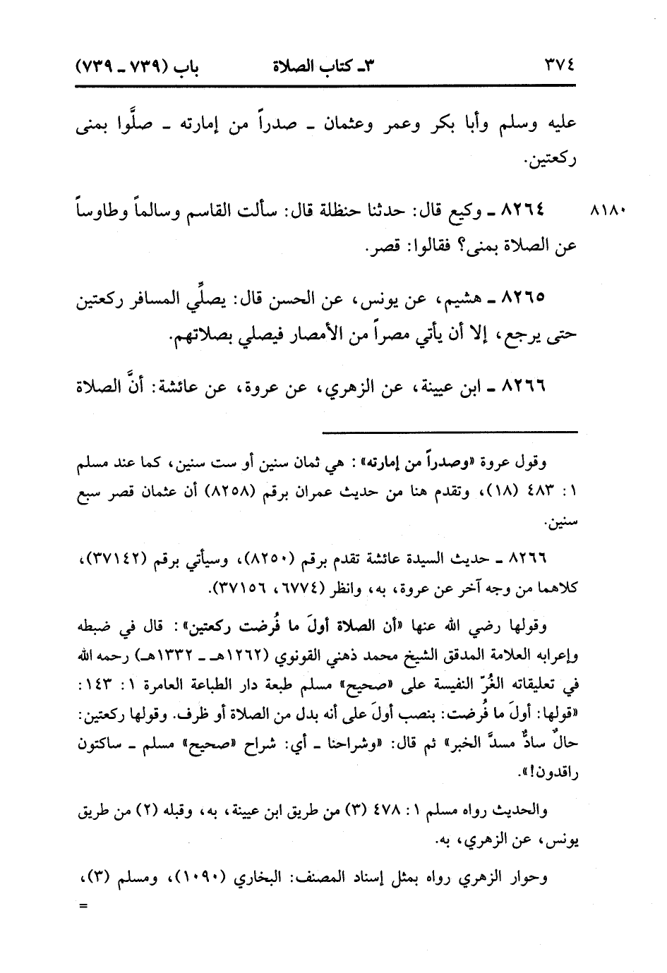 8266- حَدَّثَنَا ابْنُ عُيَيْنَةَ ، عَنِ الزُّهْرِيِّ ، عَنْ عُرْوَةَ ، عَنْ عَائِشَةَ ؛ أَنَّ الصَّلاَة أَوَّلُ مَا فُرِضَتْ رَكْعَتَيْنِ فَزِيدَتْ فِي صَلاَةِ الْحَضَرِ وَأُقِرَّتْ صَلاَةُ السَّفَرِ ، فَقُلْت لِعُرْوَةِ : مَا بَالُ عَائِشَةَ كَانَتْ تُتِمُّ الصَّلاَة فِي السَّفَرِ وَهِيَ تَقُولُ هَذَا ؟ قَالَ : تَأَوَّلَتْ مَا تَأَوَّلَ عُثْمَانَ فَلَمْ أَسْأَلْهُ مَا تَأَوَّلَ عُثْمَانَ. (2/451).