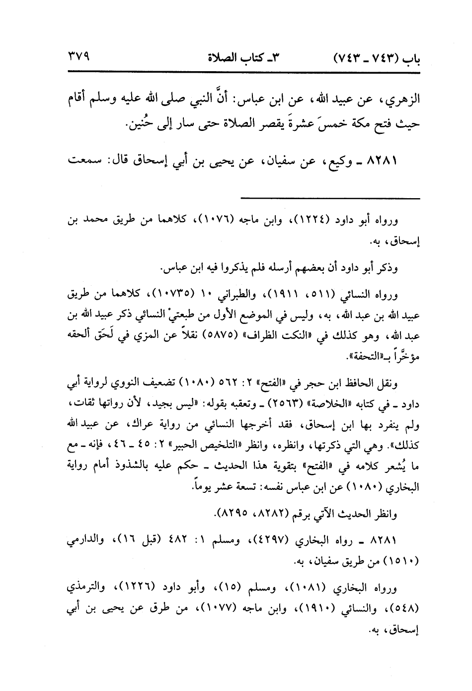 8280- حَدَّثَنَا عَبْدُ اللهِ بْنُ إدْرِيسَ ، عَنْ مُحَمَّدِ بْنِ إِسْحَاقَ ، عَنِ الزُّهْرِيِّ ، عَنْ عُبَيْدِ اللهِ ، عَنِ ابْنِ عَبَّاسٍ ؛ أَنَّ النَّبِيَّ صَلَّى الله عَلَيْهِ وَسَلَّمَ أقَامَ حَيْثُ فَتَحَ مَكَّةَ خَمْسَ عَشْرَةَ يَقْصُرُ الصَّلاَة حَتَّى سَارَ إلَى حُنَيْنٍ.