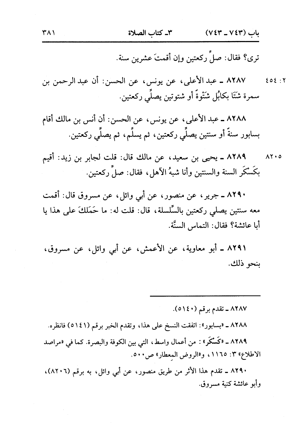 8290- حَدَّثَنَا جَرِيرٌ ، عَنْ مَنْصُورٍ ، عَنْ أَبِي وَائِلٍ ، عَنْ مَسْرُوقٍ ، قَالَ : أَقَمْتُ مَعَهُ سَنَتَيْنِ يُصَلِّي رَكْعَتَيْنِ بِالسِّلْسِلَةِ ، قَالَ : قُلْتُ لَهُ : مَا حَمَلَك عَلَى هَذَا يَا أَبَا عَائِشَةَ ؟ فَقَالَ : الْتِمَاسُ السُّنَّةِ.