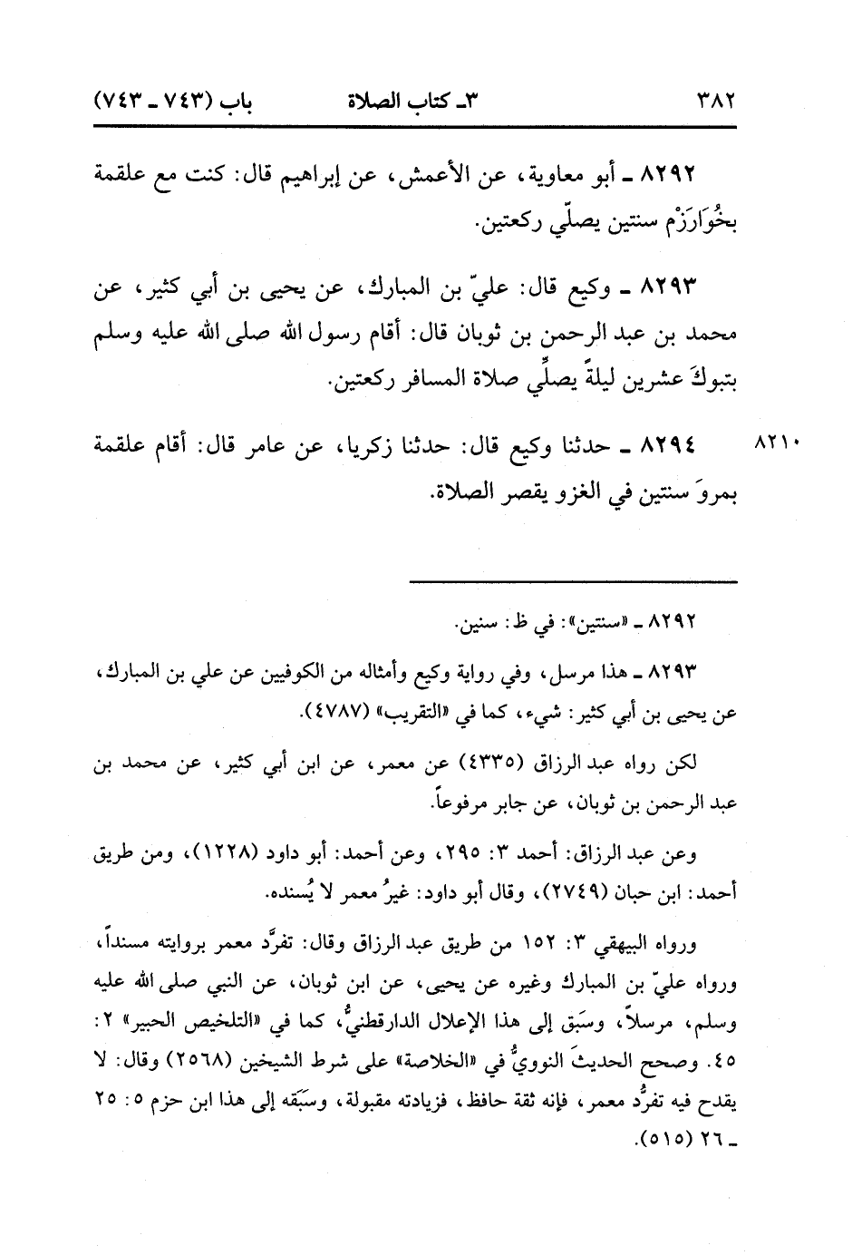 8294- حَدَّثَنَا وَكِيعٌ , قَالَ : حدَّثَنَا زَكَرِيَّا عَنْ عَامِرٍ قَالَ : أَقَامَ عَلْقَمَةُ بِمَرْوَ سَنَتَيْنِ فِي الْغَزْوِ يَقْصُرُ الصَّلاَة. (2/454).