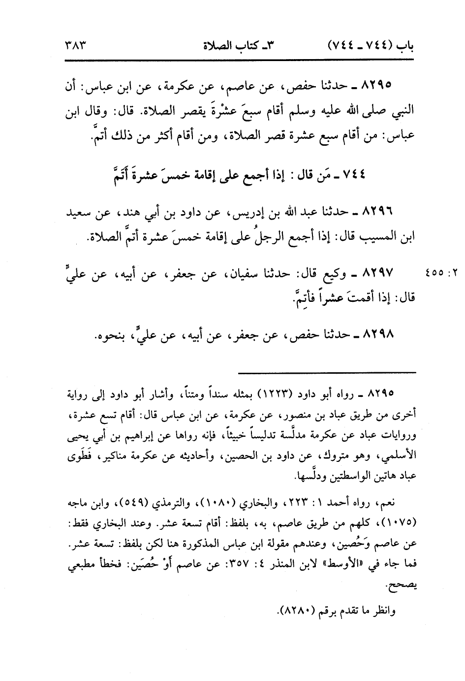 8295- حَدَّثَنَا حَفْصٌ ، عَنْ عَاصِمٍ ، عَنْ عِكْرِمَةَ ، عَنِ ابْنِ عَبَّاسٍ ؛ أَنَّ النَّبِيَّ صَلَّى الله عَلَيْهِ وَسَلَّمَ أَقَامَ سَبْعَ عَشْرَةَ يَقْصُرُ الصَّلاَة ، قَالَ : وَقَالَ ابْنُ عَبَّاسٍ : مَنْ أَقَامَ سَبْعَ عَشْرَةَ قَصَرَ الصَّلاَة وَمَنْ أَقَامَ أَكْثَرَ مِنْ ذَلِكَ أَتَمَّ.