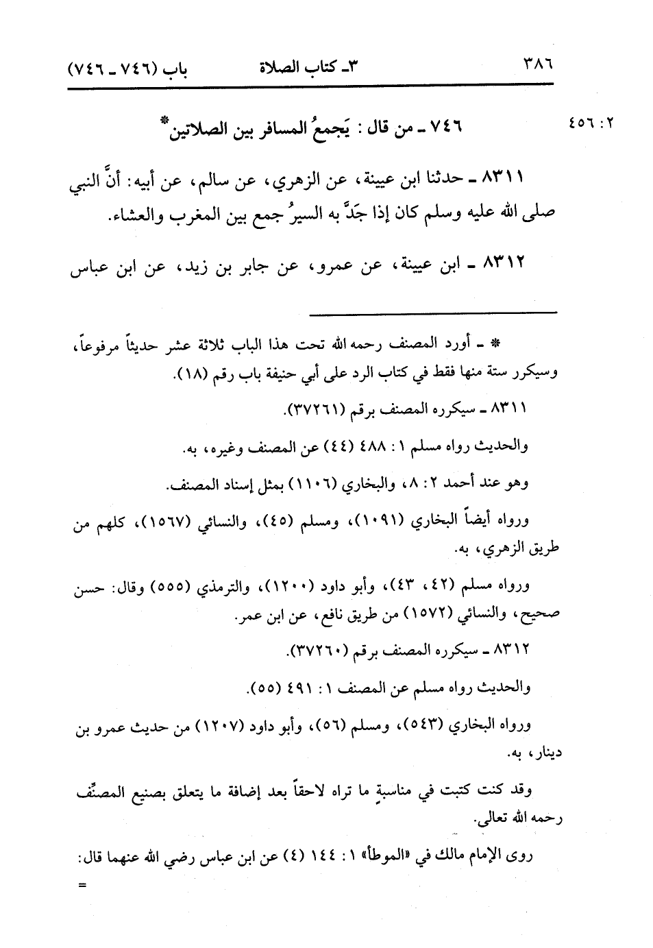 8311- حَدَّثَنَا ابْنُ عُيَيْنَةَ ، عَنِ الزُّهْرِيِّ ، عَنْ سَالِمٍ ، عَنْ أَبِيهِ ؛ أَنَّ النَّبِيَّ صَلَّى الله عَلَيْهِ وَسَلَّمَ كَانَ إذَا جَدَّ بِهِ السَّيْرُ جَمَعَ بَيْنَ الْمَغْرِبِ وَالْعِشَاءِ. (2/456).