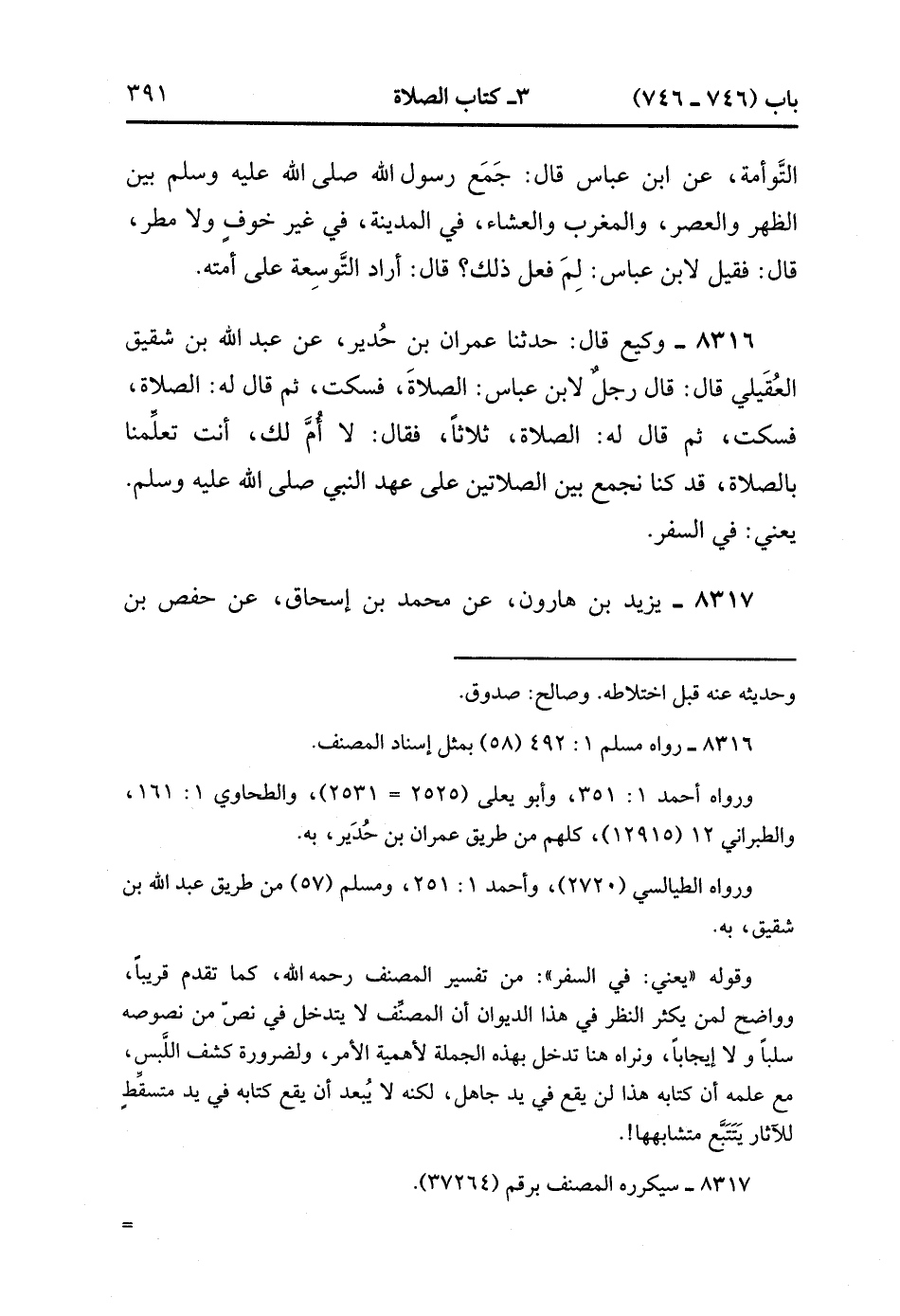 8316- حَدَّثَنَا وَكِيعٌ , قَالَ : حدَّثَنَا عِمْرَانُ بْنُ حُدَيْرٍ ، عَنْ عَبْدِ اللهِ بْنِ شَقِيقٍ الْعُقَيْلِيِّ ، قَالَ : قَالَ رَجُلٌ لاِبْنِ عَبَّاسٍ : الصَّلاَة فَسَكَتَ ، ثُمَّ قَالَ لَهُ : الصَّلاَة فَسَكَتَ ، ثُمَّ قَالَ لَهُ : الصَّلاَة ثَلاَثًا ، فَقَالَ : لاَ أُمَّ لَكَ أَنْتَ تُعَلِّمُنَا بِالصَّلاَة ، قَدْ كُنَّا نَجْمَعُ بَيْنَ الصَّلاَتَيْنِ عَلَى عَهْدِ النَّبِيِّ صَلَّى الله عَلَيْهِ وَسَلَّمَ ، يَعْنِي فِي السَّفَرِ.
