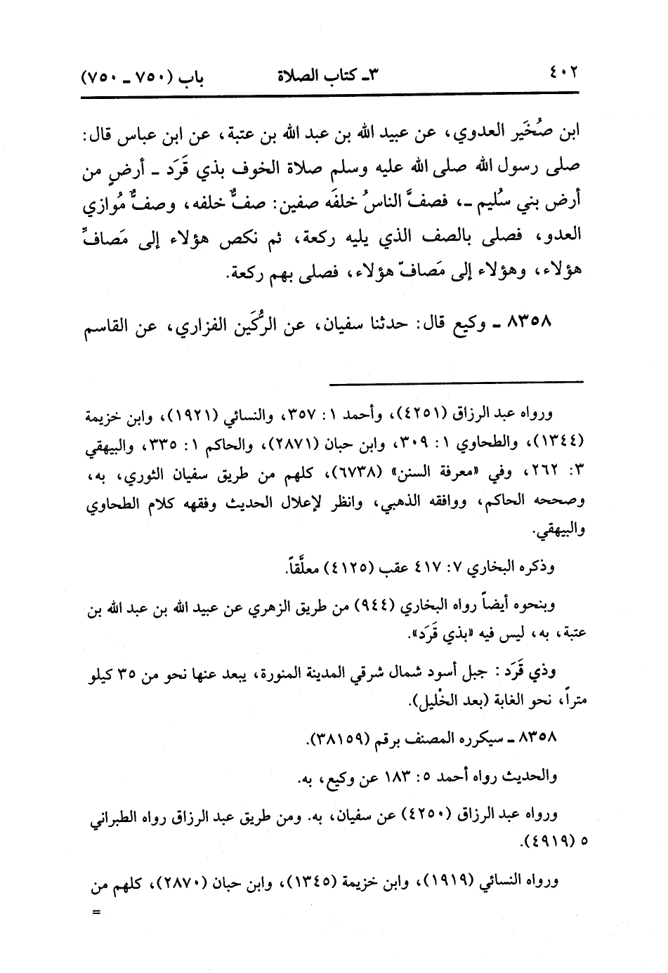 8357- حَدَّثَنَا وَكِيعٌ , قَالَ : حدَّثَنَا سُفْيَانُ ، عَنْ أَبِي بَكْرٍ بْنِ أَبِي الْجَهْمِ بن صُخَيْرٍ الْعَدَوِيِّ ، عَنْ عُبَيْدِ اللهِ بْنِ عَبْدِ اللهِ بْنِ عُتْبَةَ ، عَنِ ابْنِ عَبَّاسٍ ، قَالَ : صَلَّى رَسُولُ اللهِ صَلَّى الله عَلَيْهِ وَسَلَّمَ صَلاَةَ الْخَوْفِ بِذِي قَرَدٍ أَرْضٍ مِنْ أَرْضِ بَنِي سُلَيْمٍ ، فَصَفَّ النَّاسُ خَلفَهُ صَفَّيْنِ ، صَفٌّ خَلْفَهُ ، وَصَفٌّ مُوَاز الْعَدُوَّ ، فَصَلَّى بِالصَّفِّ الَّذِي يَلِيهِ رَكْعَةً ، ثُمَّ نَكَصَ هَؤُلاَءِ إلَى مَصَافِّ هَؤُلاَءِ وَهَؤُلاَءِ إلَى مَصَافِّ هَؤُلاَءِ فَصَلَّى بِهِمْ رَكْعَةً. (2/461).