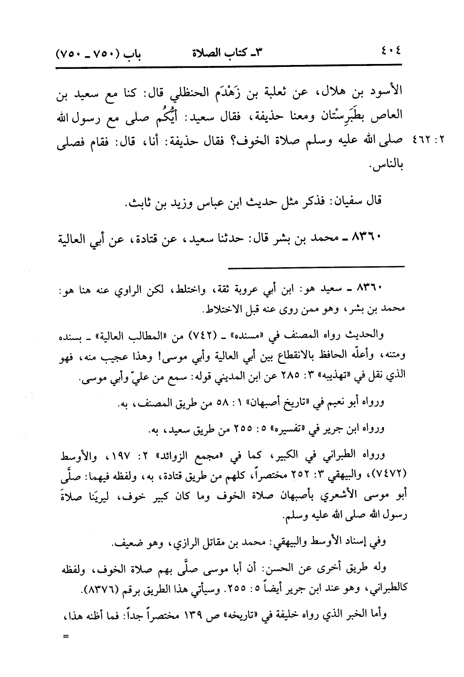 8359- حَدَّثَنَا وَكِيعٌ , قَالَ : حدَّثَنَا سُفْيَانُ ، عَنْ أَشْعَثَ بن أَبِي الشَّعْثَاءِ ، عَنِ الأَسْوَدِ بْنِ هِلاَلٍ ، عَنْ ثَعْلَبَةَ بْنِ زَهْدَمٍ الْحَنْظَلِيِّ ، قَالَ : كُنَّا مَعَ سَعِيدِ بْنِ الْعَاصِ بِطَبَرِسْتَانَ وَمَعَنَا حُذَيْفَةُ ، فَقَالَ سَعِيدٌ : أَيُّكُمْ صَلَّى مَعَ رَسُولِ اللهِ صَلَّى الله عَلَيْهِ وَسَلَّمَ صَلاَةَ الْخَوْفِ ؟ فَقَالَ : حُذَيْفَةُ : أَنَا ، قَالَ : فَقَامَ فَصَلَّى بِالنَّاسِ.