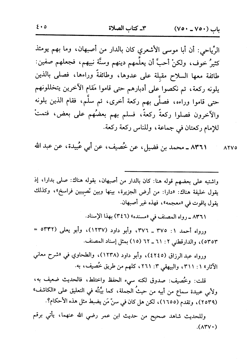 8360- حَدَّثَنَا مُحَمَّدُ بْنُ بِشْرٍ , قَالَ : حدَّثَنَا سَعِيدٌ ، عَنْ قَتَادَةَ ، عَنْ أَبِي الْعَالِيَةِ الرِّيَاحِيِّ ؛ أَنَّ أَبَا مُوسَى الأَشْعَرِِي كَانَ بِالدَّارِ مِنْ أَصْبَهَانَ وَمَا بِهِمْ يَوْمَئِذٍ كَثِيرُ خَوْفٍ وَلَكِنْ أَحَبَّ أَنْ يُعَلِّمَهُمْ دِينَهُمْ وَسُنَّةَ نَبِيِّهِمْ فَجَعَلَهُمْ صَفَّيْنِ ، طَائِفَةٌ مَعَهَا السِّلاَحُ مُقْبِلَةٌ عَلَى عَدُوِّهَا وَطَائِفَةٌ وَرَاءَهَا ، فَصَلَّى بِاَلَّذِينَ يَلُونَه رَكْعَةً ، ثُمَّ نَكَصُوا عَلَى أَدْبَارِهِمْ حَتَّى قَامُوا مَقَامَ الآخَرِينَ يَتَخَلَّلُونَهُمْ حَتَّى قَامُوا وَرَاءَهُ فَصَلَّى بِهِمْ رَكْعَةً أُخْرَى ، ثُمَّ سَلَّمَ ، فَقَامَ الَّذِينَ يَلُونَ وَالأَخَرُونَ فَصَلَّوْا رَكْعَةً رَكْعَةً فَسَلَّمَ بِهِمْ بَعْضُهُمْ عَلَى بَعْضٍ فَتَمَّتْ لِلإِمَامِ رَكْعَتَانِ فِي جَمَاعَةٍ وَلِلنَّاسِ رَكْعَةٌ رَكْعَةٌ. (2/462).