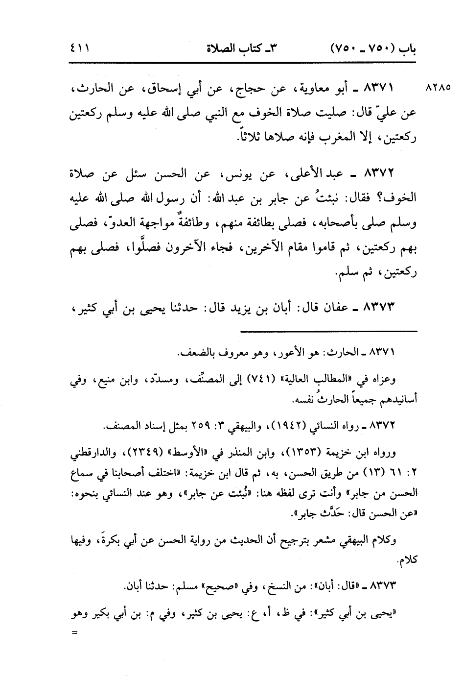 8371- حَدَّثَنَا أَبُو مُعَاوِيَةَ ، عَنْ حَجَّاجٍ ، عَنْ أَبِي إِسْحَاقَ ، عَنِ الْحَارِثِ ، عَنْ عَلِيٍّ ، قَالَ : صَلَّيْت صَلاَةَ الْخَوْفِ مَعَ النَّبِيِّ صَلَّى الله عَلَيْهِ وَسَلَّمَ رَكْعَتَيْنِ رَكْعَتَيْنِ إِلاَّ الْمَغْرِبَ ، فَإِنَّهُ صَلاَّهَا ثَلاَثًا.