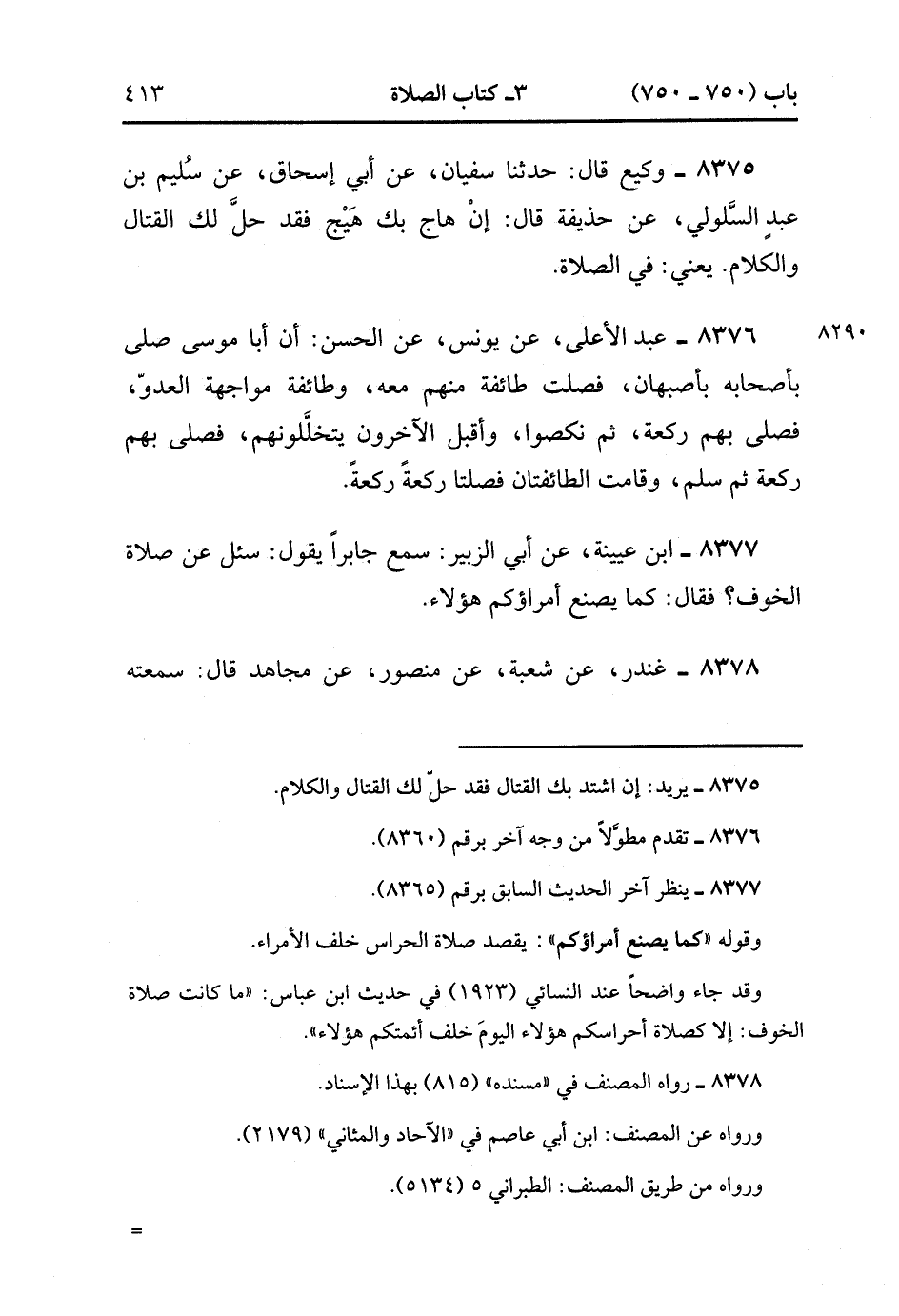 8377- حَدَّثَنَا ابْنُ عُيَيْنَةَ ، عَنْ أَبِي الزُّبَيْرِ ، سَمِعَ جَابِرًا يَقُولُ : سُئِلَ عَنْ صَلاَةِ الْخَوْفِ ؟ فَقَالَ : كَمَا يَصْنَعُ أُمَرَاؤُكُمْ هَؤُلاَءِ. (2/465).