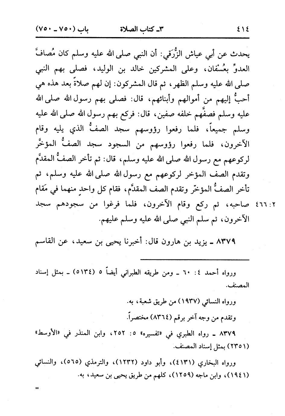 8378- حَدَّثَنَا غُنْدَرٌ ، عَنْ شُعْبَةَ ، عَنْ مَنْصُورٍ ، عَنْ مُجَاهِدٍ ، قَالَ : سَمِعْتُهُ يُحَدِّثُ ، عَنْ أَبِي عَيَّاشٍ الزُّرَقِيِّ ؛ أَنَّ النَّبِيَّ صَلَّى الله عَلَيْهِ وَسَلَّمَ كَانَ مُصَافَّ الْعَدُوِّ بِعُسْفَانَ وَعَلَى الْمُشْرِكِينَ خَالِدُ بْنُ الْوَلِيدِ ، فَصَلَّى بِهِمُ النَّبِيُّ صَلَّى الله عَلَيْهِ وَسَلَّمَ الظُّهْرَ ، ثُمَّ قَالَ الْمُشْرِكُونَ : إنَّ لَهُمْ صَلاَةً بَعْدَ هَذِهِ هِيَ أَحَبُّ إلَيْهِمْ مِنْ أَمْوَالِهِمْ وَأَبْنَائِهِمْ ، قَالَ : فَصَلَّى بِهِمْ رَسُولُ اللهِ صَلَّى الله عَلَيْهِ وَسَلَّمَ فَصَفَّهُمْ خَلْفَهُ صَفَّيْنِ ، قَالَ : فَرَكَعَ بِهِمْ رَسُولُ اللهِ صَلَّى الله عَلَيْهِ وَسَلَّمَ جَمِيعًا ، فَلَمَّا رَفَعُوا رُؤُوسَهُمْ سَجَدَ الصَّفُّ الَّذِي يَلِيهِ وَقَامَ الآخَرُونَ ، فَلَمَّا رَفَعُوا رُؤُوسَهُمْ مِنَ السُّجُودِ سَجَدَ الصَّفُّ الْمُؤَخَّرُ لِرُكُوعِهِمْ مَعَ رَسُولِ اللهِ صَلَّى الله عَلَيْهِ وَسَلَّمَ ، قَالَ : ثُمَّ تَأَخَّرَ الصَّفُّ الْمُقَدَّمُ وَتَقَدَّمَ الصَّفُّ الْمُؤَخَّرُ لِرُكُوعِهِمْ مَعَ رَسُولِ اللهِ صَلَّى الله عَلَيْهِ وَسَلَّمَ ، ثُمَّ تَأَخَّرَ الصَّفُّ الْمُؤَخَّرُ وَتَقَدَّمَ الصَّفُّ الْمُقَدَّمُ فَقَامَ كُلُّ وَاحِدٍ مِنْهُمَا فِي مَقَامِ صَاحِبِهِ ، ثُمَّ رَكَعَ وَقَامَ الآخَرُونَ ، فَلَمَّا فَرَغُوا مِنْ سُجُودِهِمْ سَجَدَ الآخَرُونَ ، ثُمَّ سَلَّمَ النَّبِيُّ صَلَّى الله عَلَيْهِ وَسَلَّمَ عَلَيْهِمْ. (2/465).