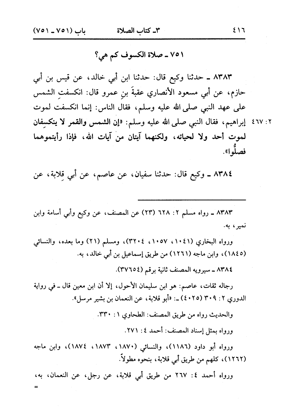 8384- حَدَّثَنَا وَكِيعٌ , قَالَ : حدَّثَنَا سُفْيَانُ ، عَنْ عَاصِمٍ ، عَنْ أَبِي قِلاَبَةَ ، عَنِ النُّعْمَانِ بْنِ بَشِيرٍ ؛ أَنَّ رَسُولَ اللهِ صَلَّى الله عَلَيْهِ وَسَلَّمَ صَلَّى فِي كُسُوفٍ نَحْوًا مِنْ صَلاَتِكُمْ يَرْكَعُ وَيَسْجُدُ. (2/467).