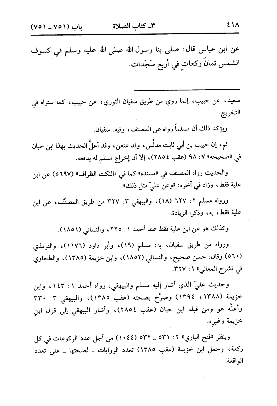 8386- حَدَّثَنَا ابْنُ عُلَيَّةَ ، وَابْنُ نُمَيْرٍ ، عَنْ سُفْيَانَ ، عَنْ حَبِيبٍ ، عَنْ طَاوُوسٍ ، عَنِ ابْنِ عَبَّاسٍ ، قَالَ : صَلَّى بِنَا رَسُولِ اللهِ صَلَّى الله عَلَيْهِ وَسَلَّمَ فِي كُسُوفِ الشَّمْسِ ، ثَمَانِ رَكَعَاتٍ فِي أَرْبَعِ سَجَدَاتٍ. (2/467).