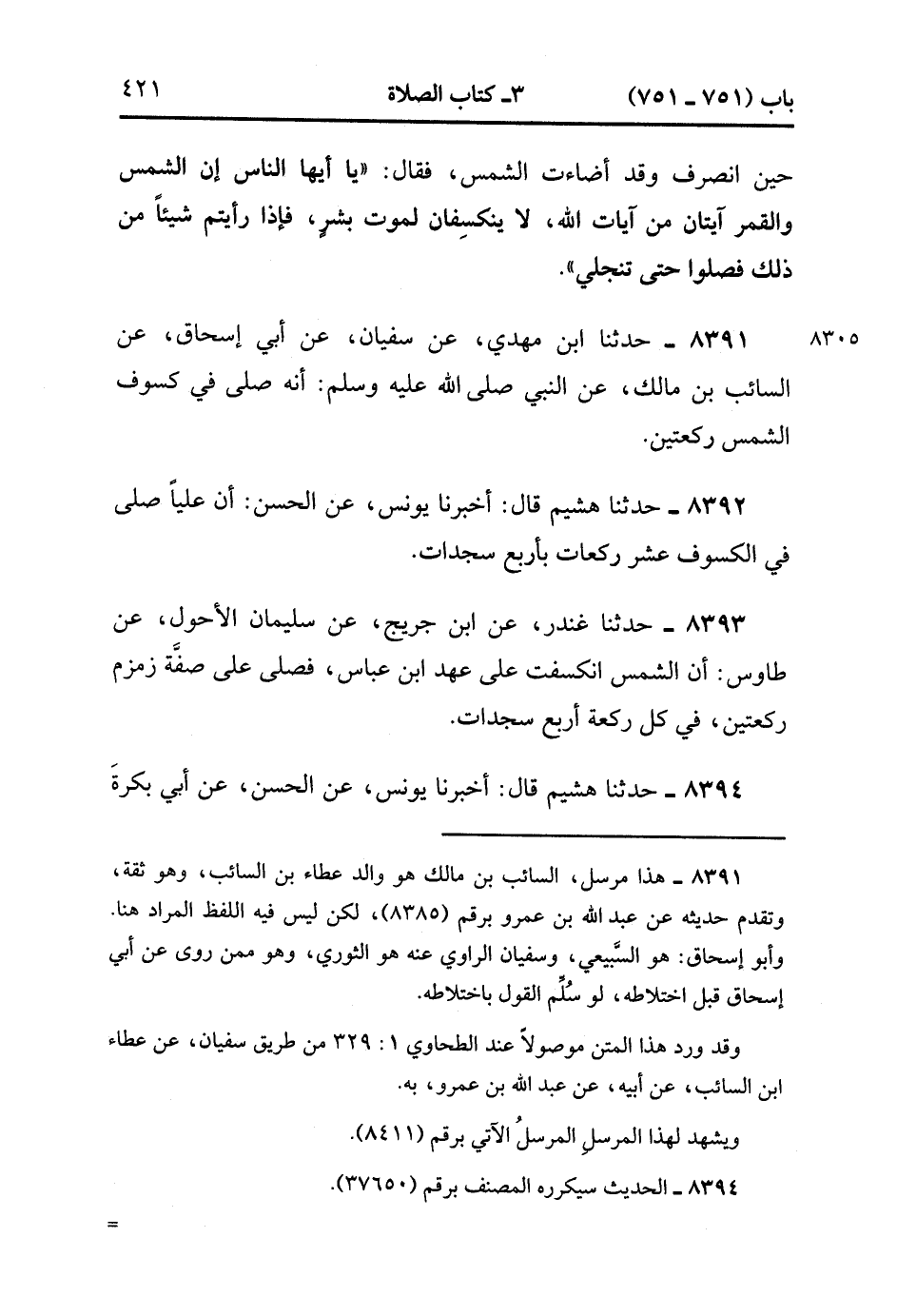 8391- حَدَّثَنَا ابْنُ مَهْدِيٍّ ، عَنْ سُفْيَانَ ، عَنْ أَبِي إِسْحَاقَ ، عَنِ السَّائِبِ بْنِ مَالِكٍ ، عَنِ النَّبِيِّ صَلَّى الله عَلَيْهِ وَسَلَّمَ ، أَنَّهُ صَلَّى فِي كُسُوفِ الشَّمْسِ رَكْعَتَيْنِ.