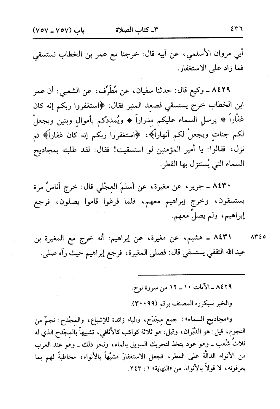 8429- حَدَّثَنَا وَكِيعٌ , قَالَ : حدَّثَنَا سُفْيَانُ ، عَنْ مُطَرِّفٍ ، عَنِ الشَّعْبِيِّ ؛ أَنَّ عُمَرَ بْنَ الْخَطَّابِ خَرَجَ يَسْتَسْقِي فَصَعِدَ الْمِنْبَرَ فَقَالَ : {اسْتَغْفِرُوا رَبَّكُمْ أَنَّهُ كَانَ غَفَّارًا يُرْسِلَ السَّمَاءَ عَلَيْكُمْ مِدْرَارًا وَيُمْدِدْكُمْ بِأَمْوَالٍ وَبَنِينَ وَيَجْعَلْ لَكُمْ جَنَّاتٍ وَيَجْعَلْ لَكُمْ أَنَّهَارًا} ، {اسْتَغْفِرُوا رَبَّكُمْ أَنَّهُ كَانَ غَفَّارًا} ، ثُمَّ نَزَلَ فَقَالُوا : يَا أَمِيرَ الْمُؤْمِنِينَ لَوِ اسْتَسْقَيْتَ ، فَقَالَ : لَقَدْ طَلَبْتُهُ بِمَجَادِيحِ السَّمَاءِ الَّتِي يُسْتَنْزَلُ بِهَا الْقَطَرُ.