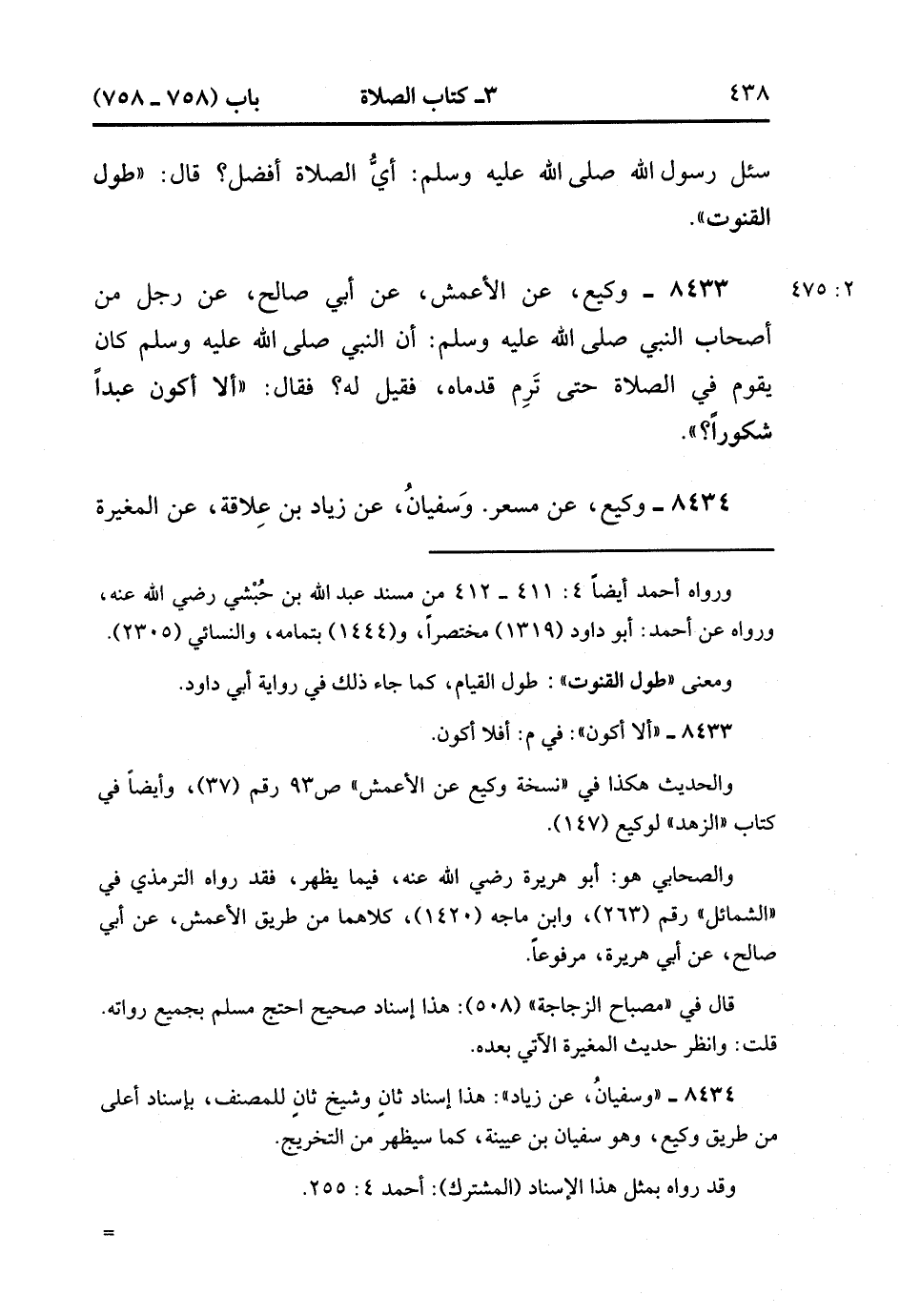 8433- حَدَّثَنَا وَكِيعٌ ، عَنِ الأَعْمَشِ ، عَنْ أَبِي صَالِحٍ ، عَنْ رَجُلٍ مِنْ أَصْحَابِ النَّبِيِّ صَلَّى الله عَلَيْهِ وَسَلَّمَ : أنَّ النَّبِيِّ صَلَّى الله عَلَيْهِ وَسَلَّمَ كَانَ يَقُومُ فِي الصَّلاَة حَتَّى تَرِمَ قَدَمَاهُ فَقِيلَ لَهُ ، فَقَالَ : أَلاَ أَكُونُ عَبْدًا شَكُورًا.