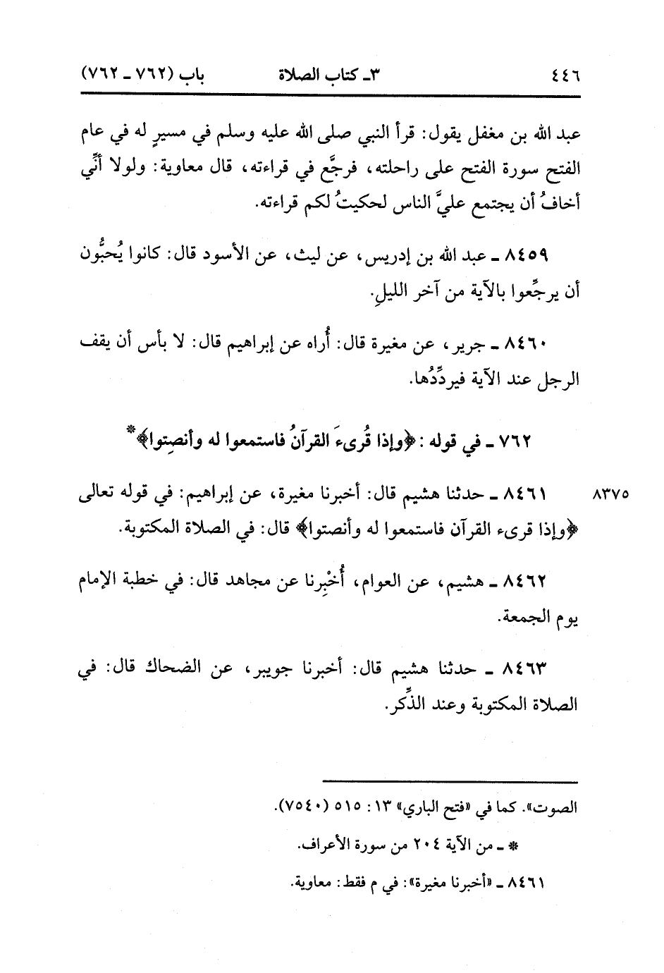 762- في قوله تَعَالَى : {وَإِذَا قُرِئَ الْقُرْآنُ فَاسْتَمِعُوا لَهُ وَأَنْصِتُوا}.